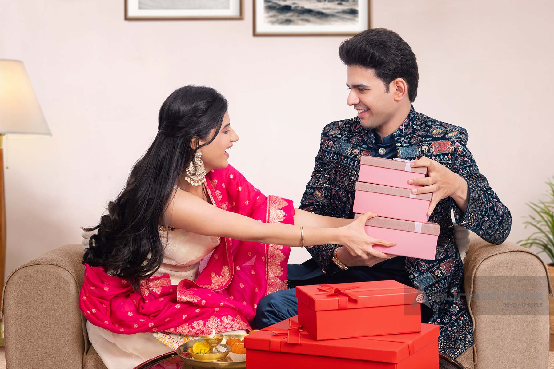 AS26060069-Brother teasing sister by taking away gifts during raksha bandhan celebration