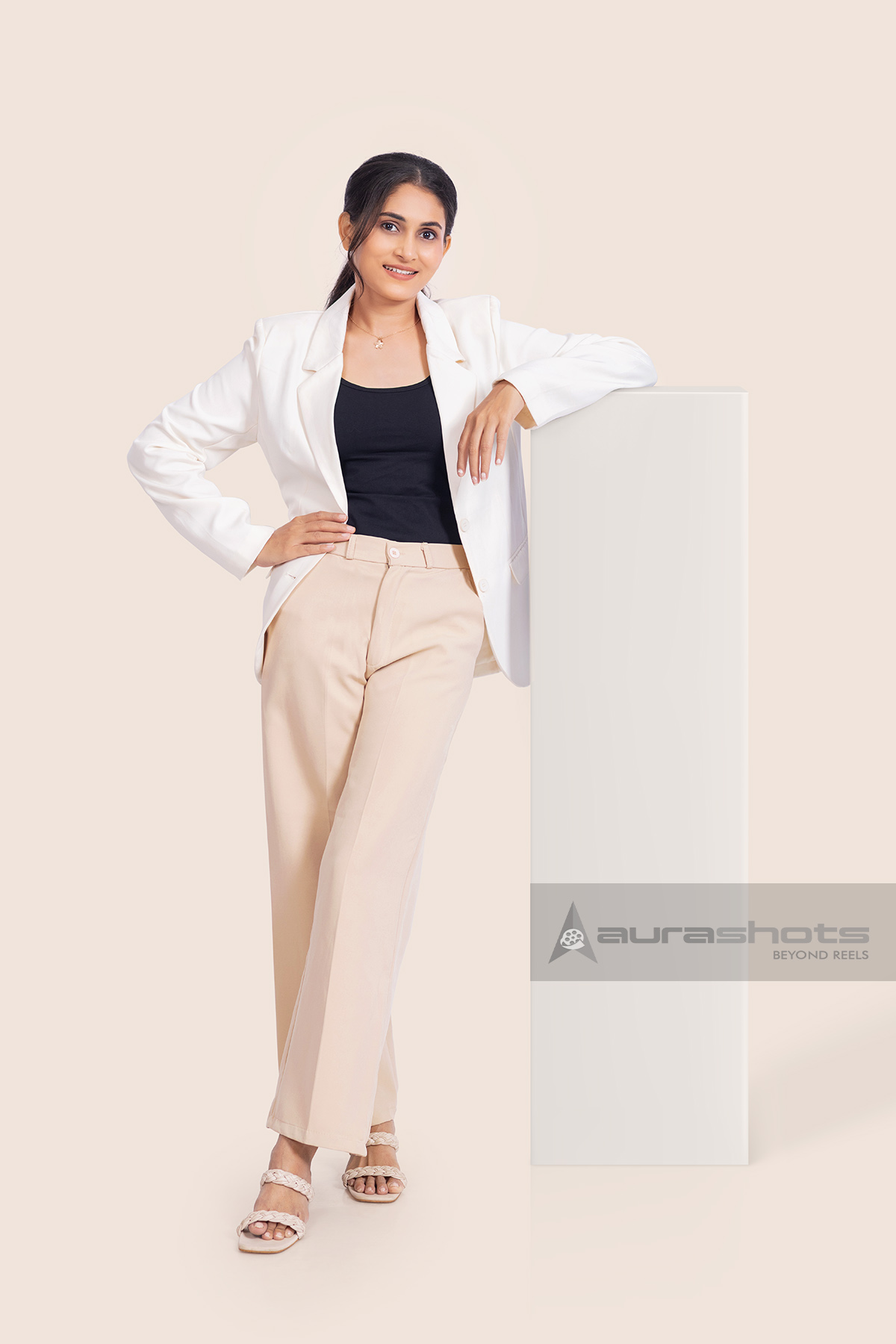 AS26030171-Confident Indian businesswoman leaning on podium in studio setting