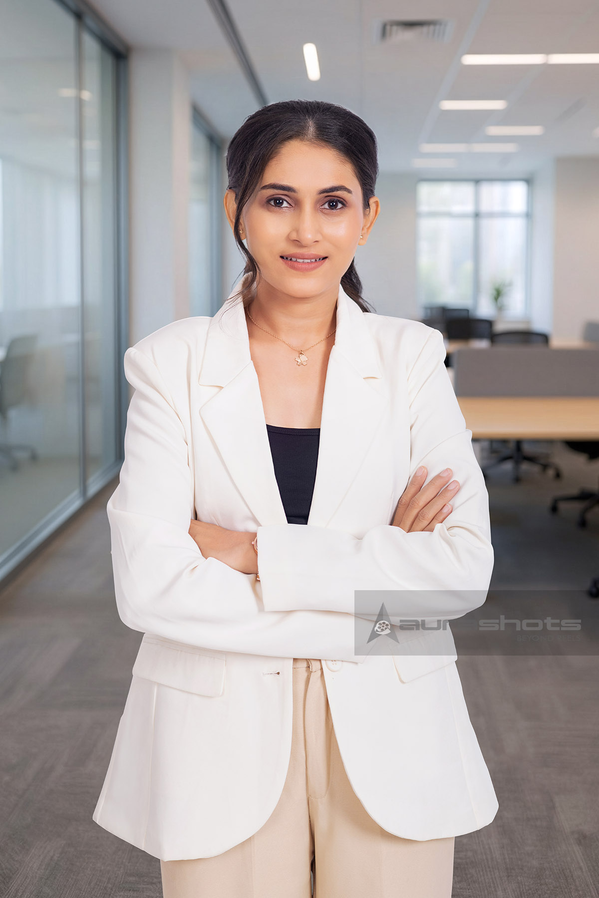 AS26030157-Confident Indian businesswoman standing with arms crossed in modern office