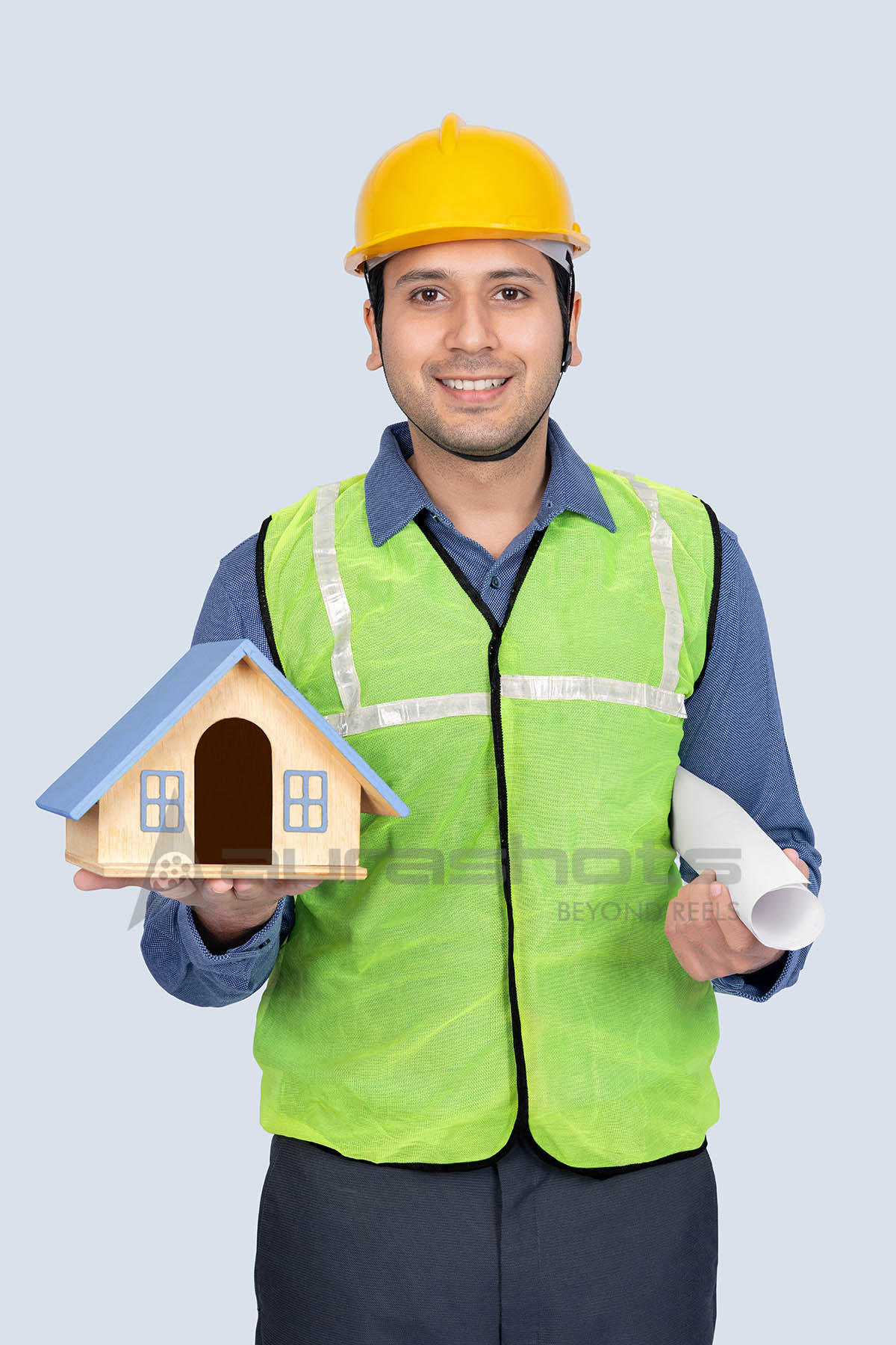 AS25120009-Construction engineer holding house model and blueprint