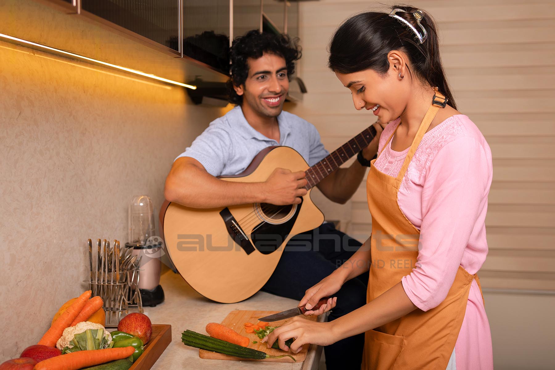 AS25021237-Couple cooking together in kitchen while Man playing guitar
