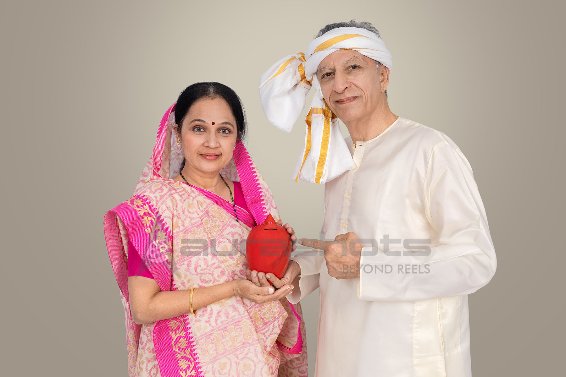 AS25140116-Elderly Indian Couple Holding Piggy Bank