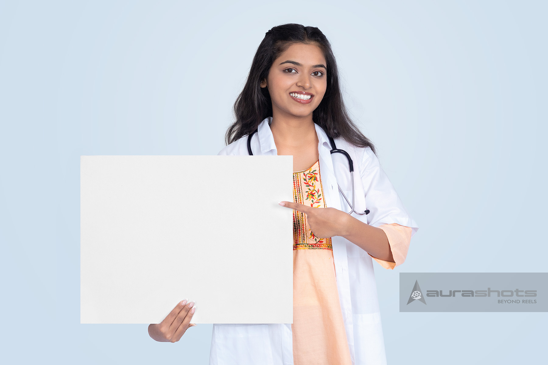 AS25110223-Female Doctor Holding and Pointing to Blank White Signboard