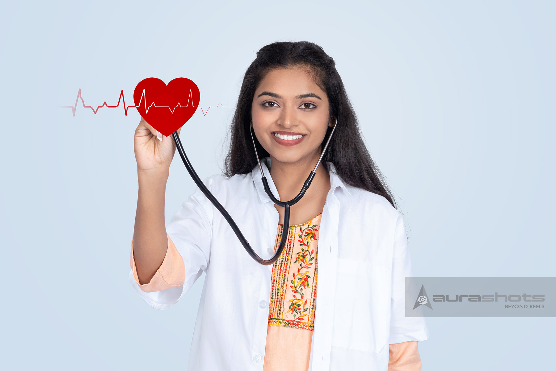 AS25110208-Female doctor holding stethoscope against heart and heartbeat icon