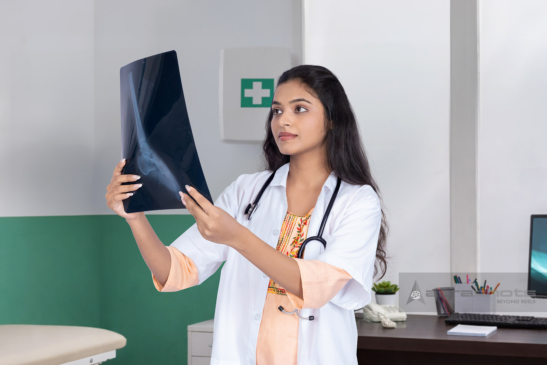 AS25110214-Female Indian doctor analyzing X-ray in clinic office