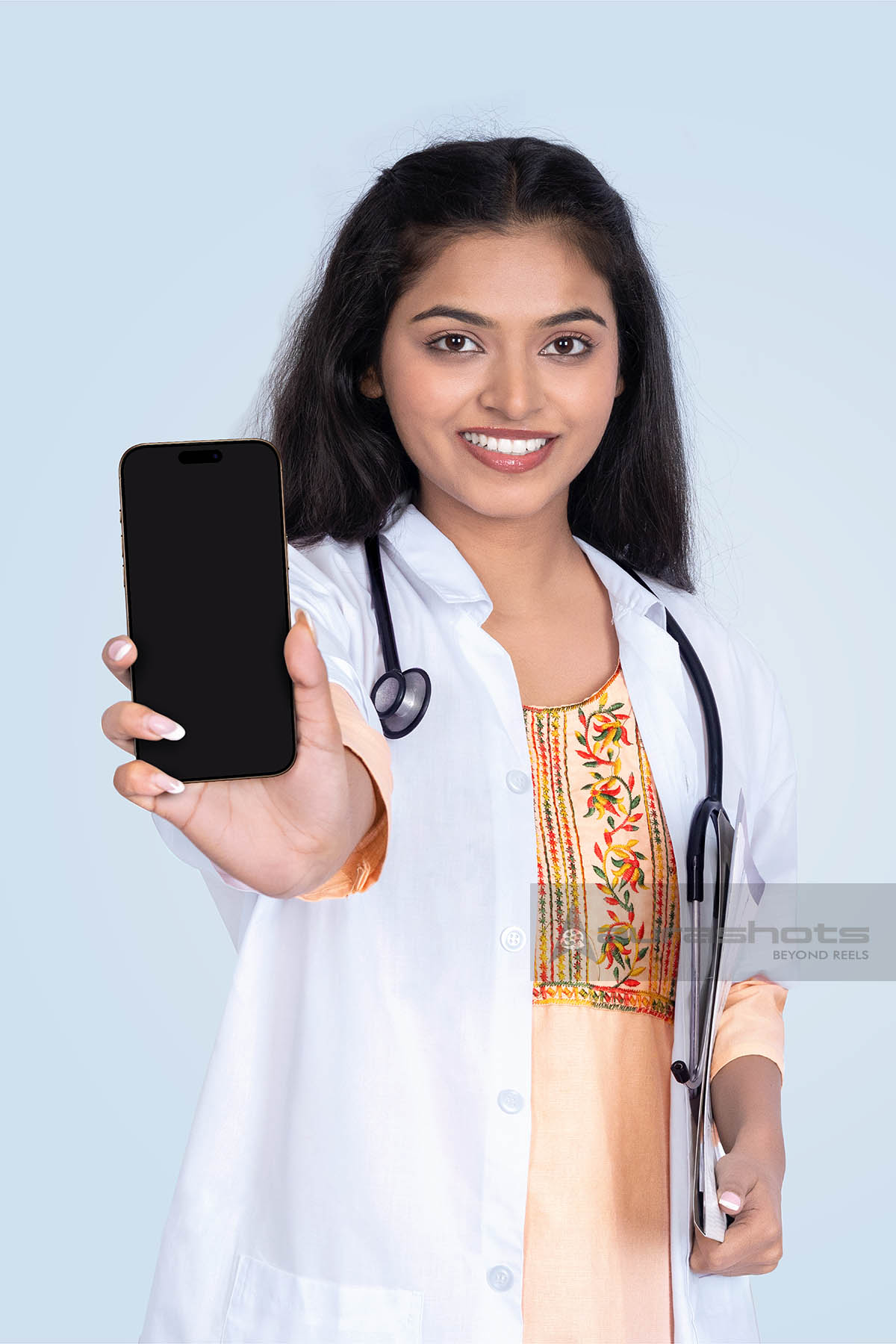 AS25110211-Female Indian doctor showing blank smartphone screen
