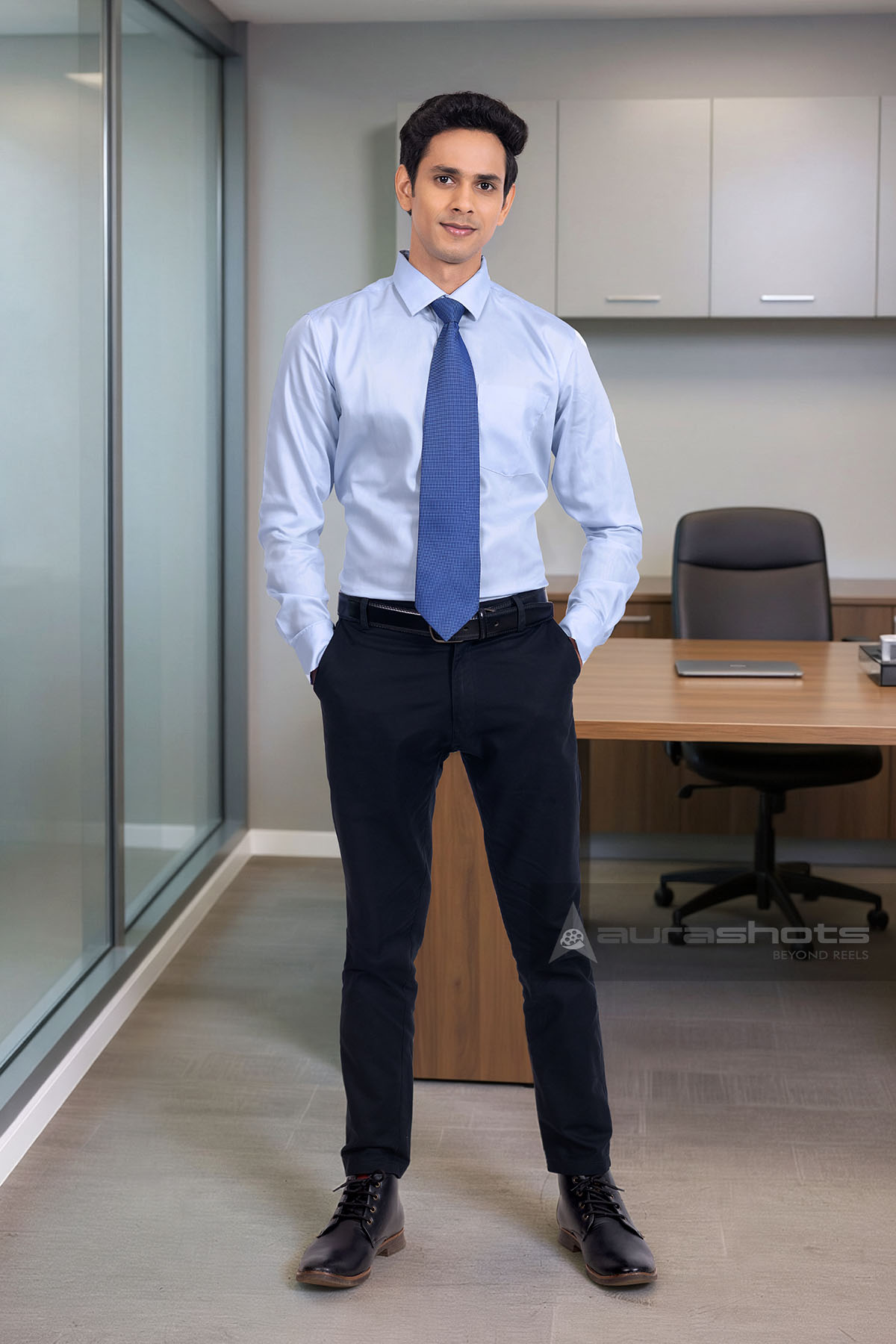AS26030024-Full length portrait of Indian corporate professional standing confidently in office
