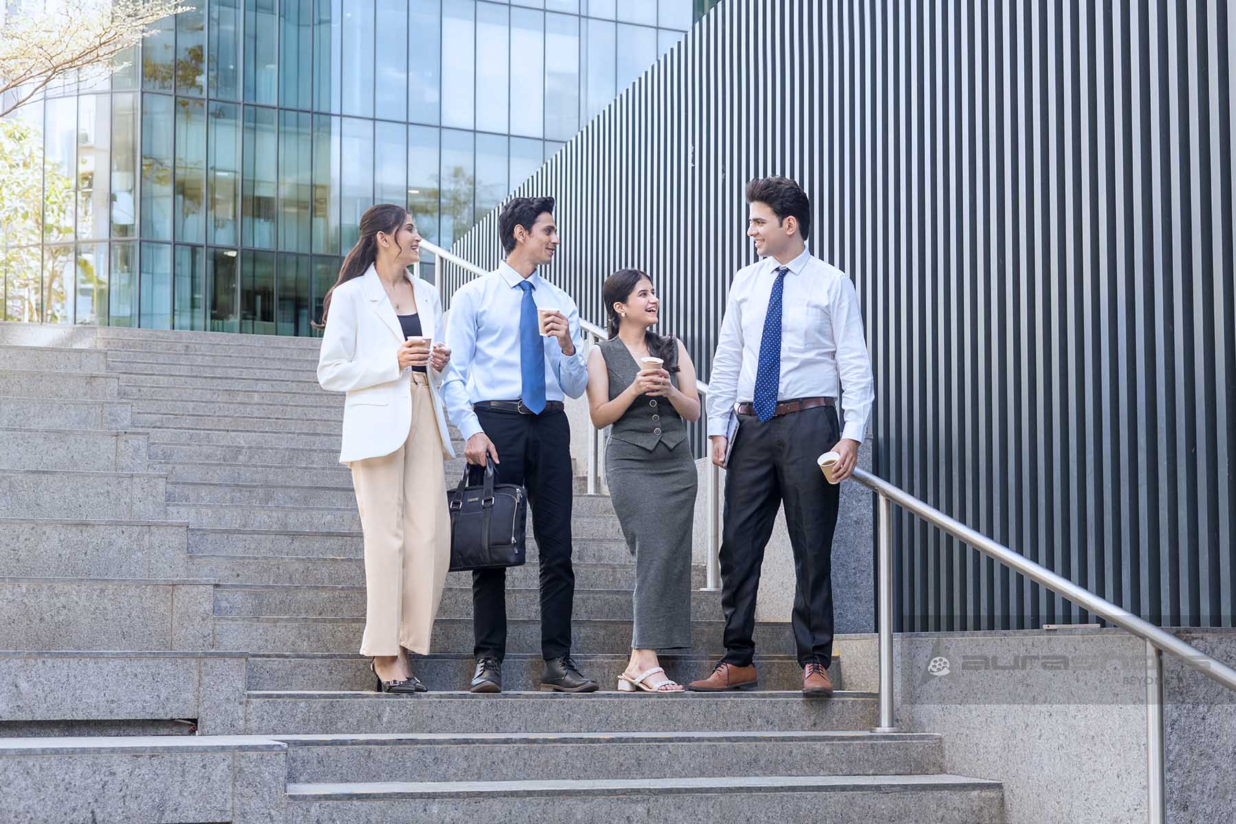 AS26030780-Group of Indian corporate professionals standing on office stairs having discussion