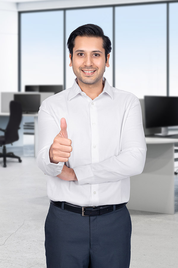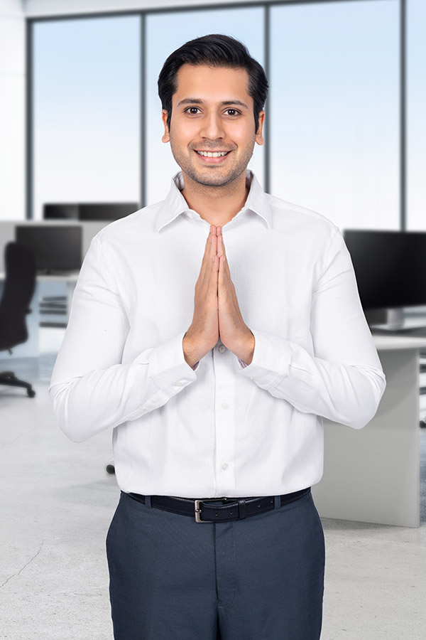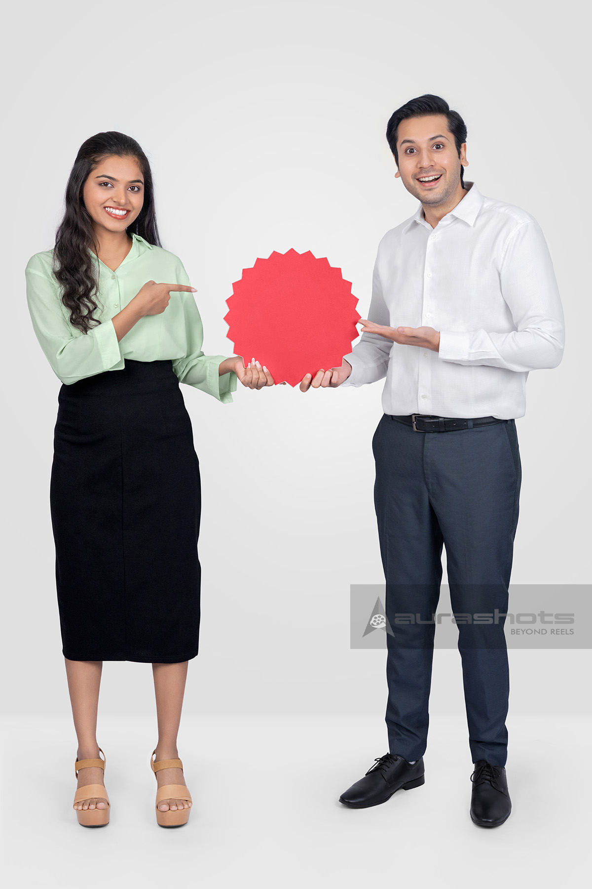 AS25080065-Happy Indian Business Professionals Presenting a Red Offer Badge