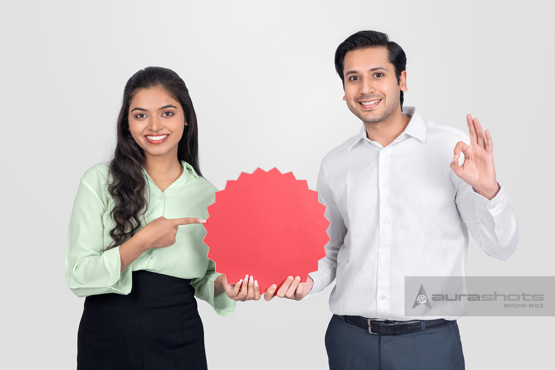 AS25080071-Happy Indian Business Professionals Presenting Promotion Board