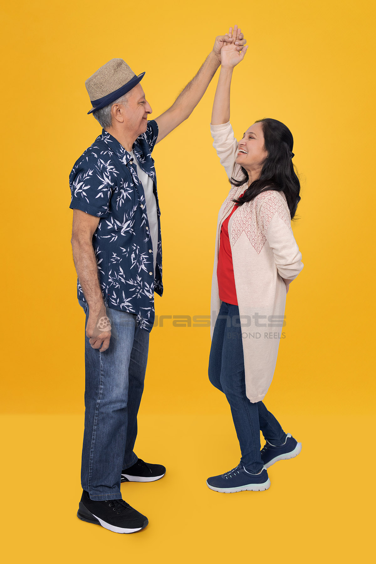 AS25090222-Happy Senior Indian Couple Dancing on Yellow Background