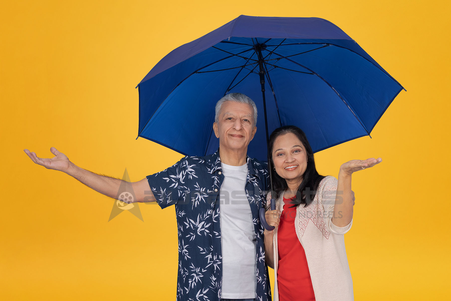 AS25090266-Happy Senior Indian Couple under Umbrella on Yellow Background