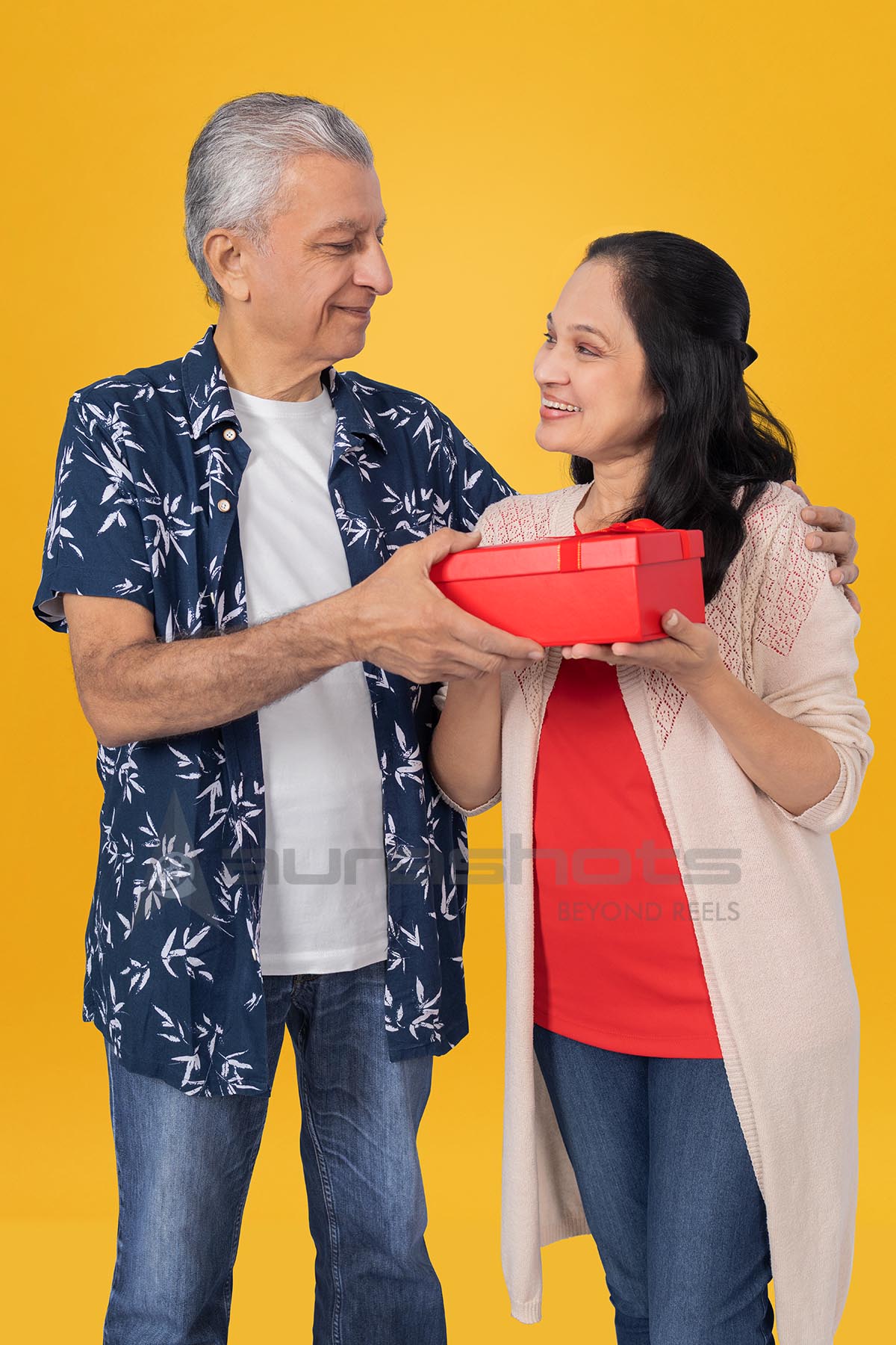 AS25090291-Happy Senior Indian Couple with a Red Gift Box