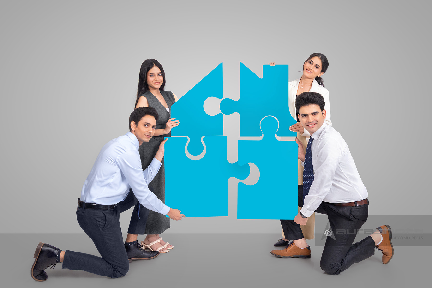 AS26030546-Indian business team forming house shape puzzle representing home loan teamwork