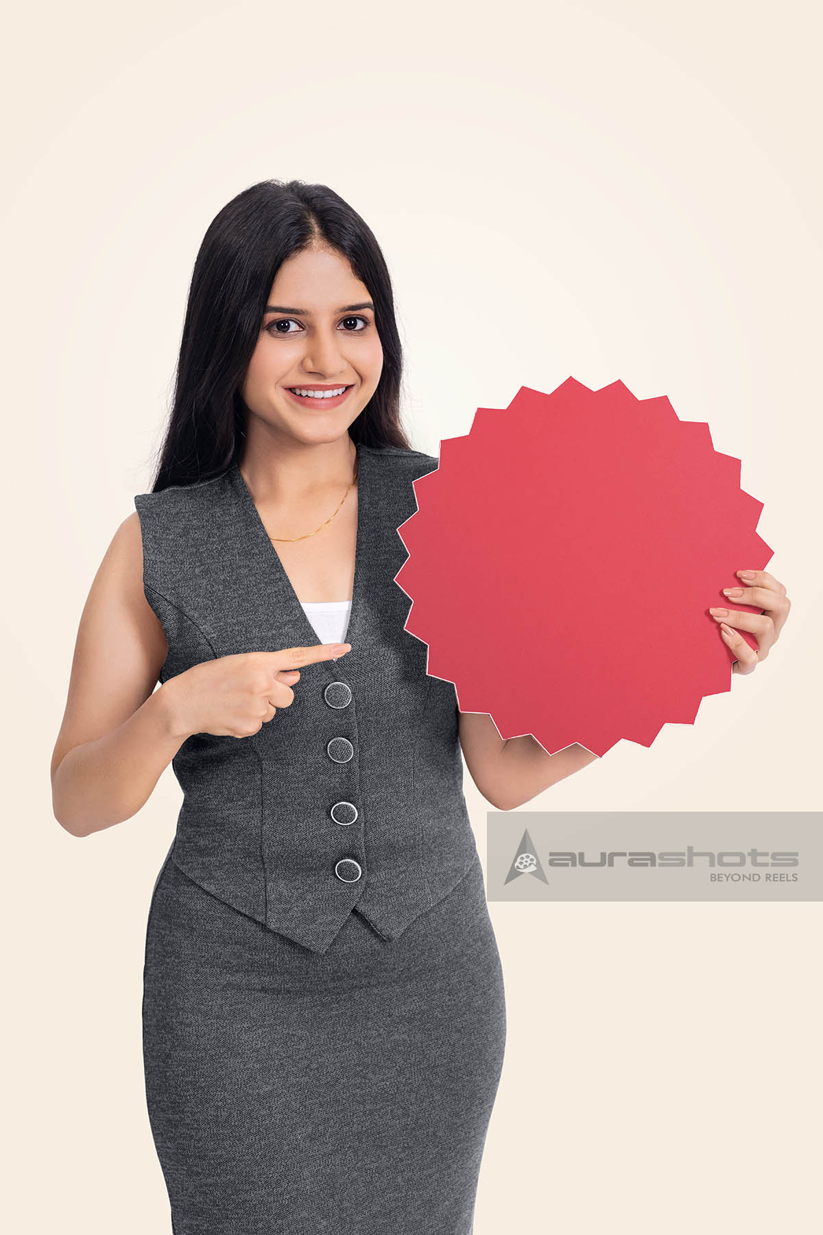 AS26030343-Indian business woman holding red sale badge and pointing at discount offer
