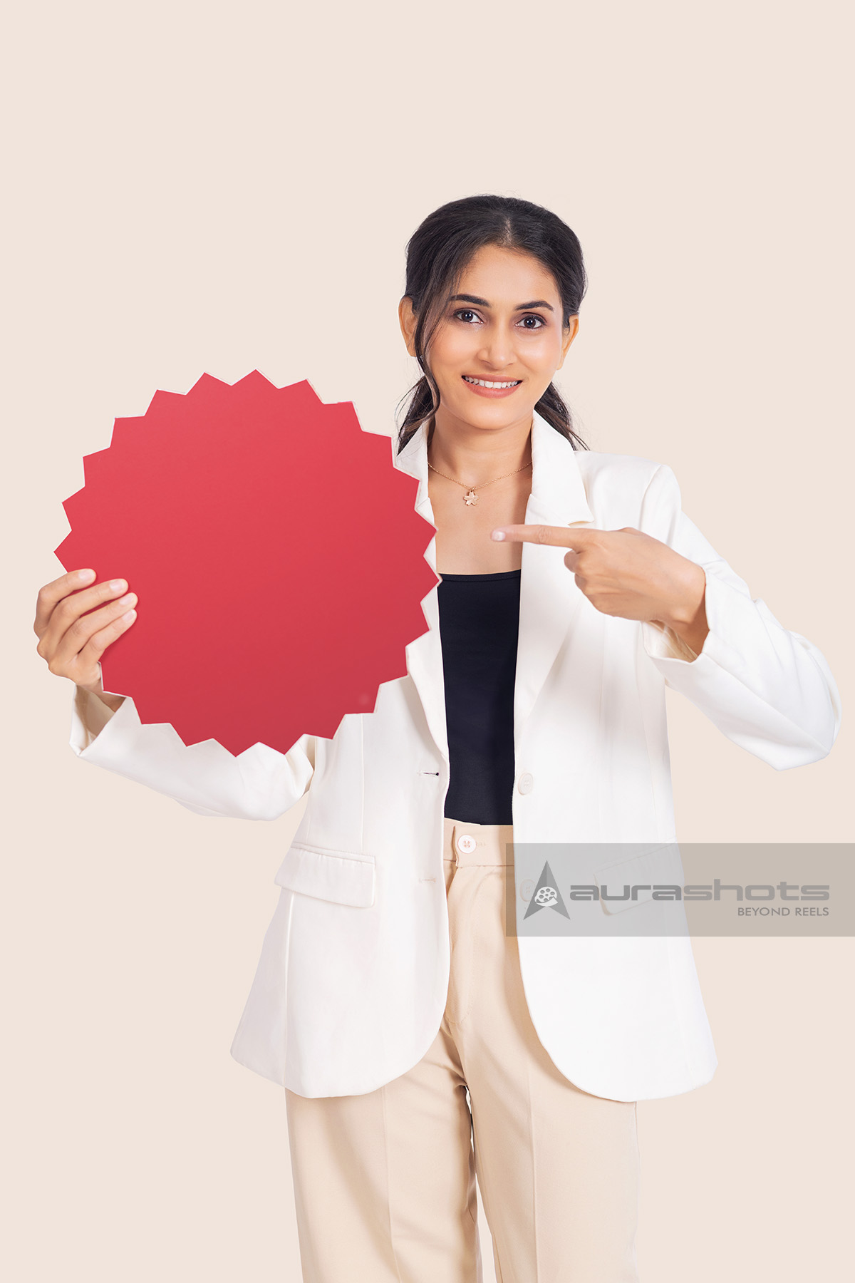 AS26030209-Indian business woman holding red sale badge and pointing at offer