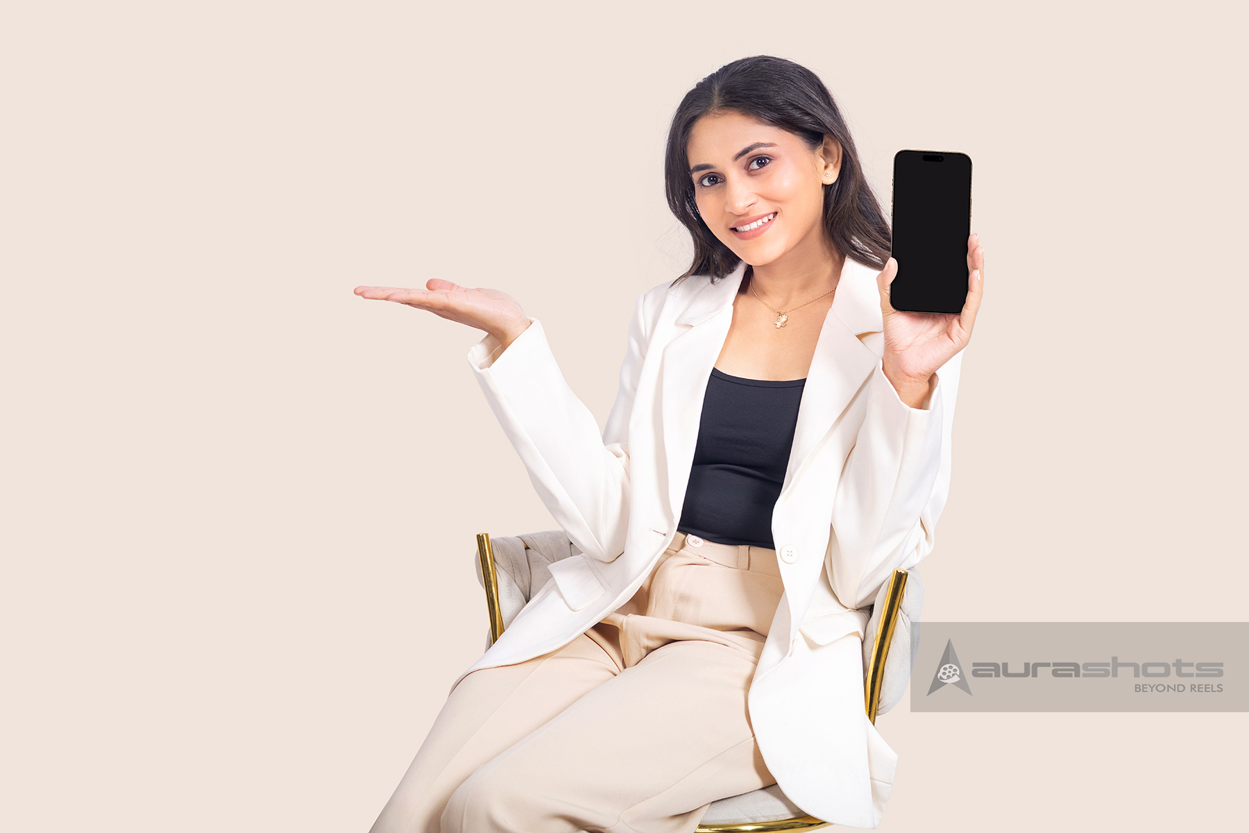 AS26030460-Indian business woman holding smartphone and presenting with open hand gesture