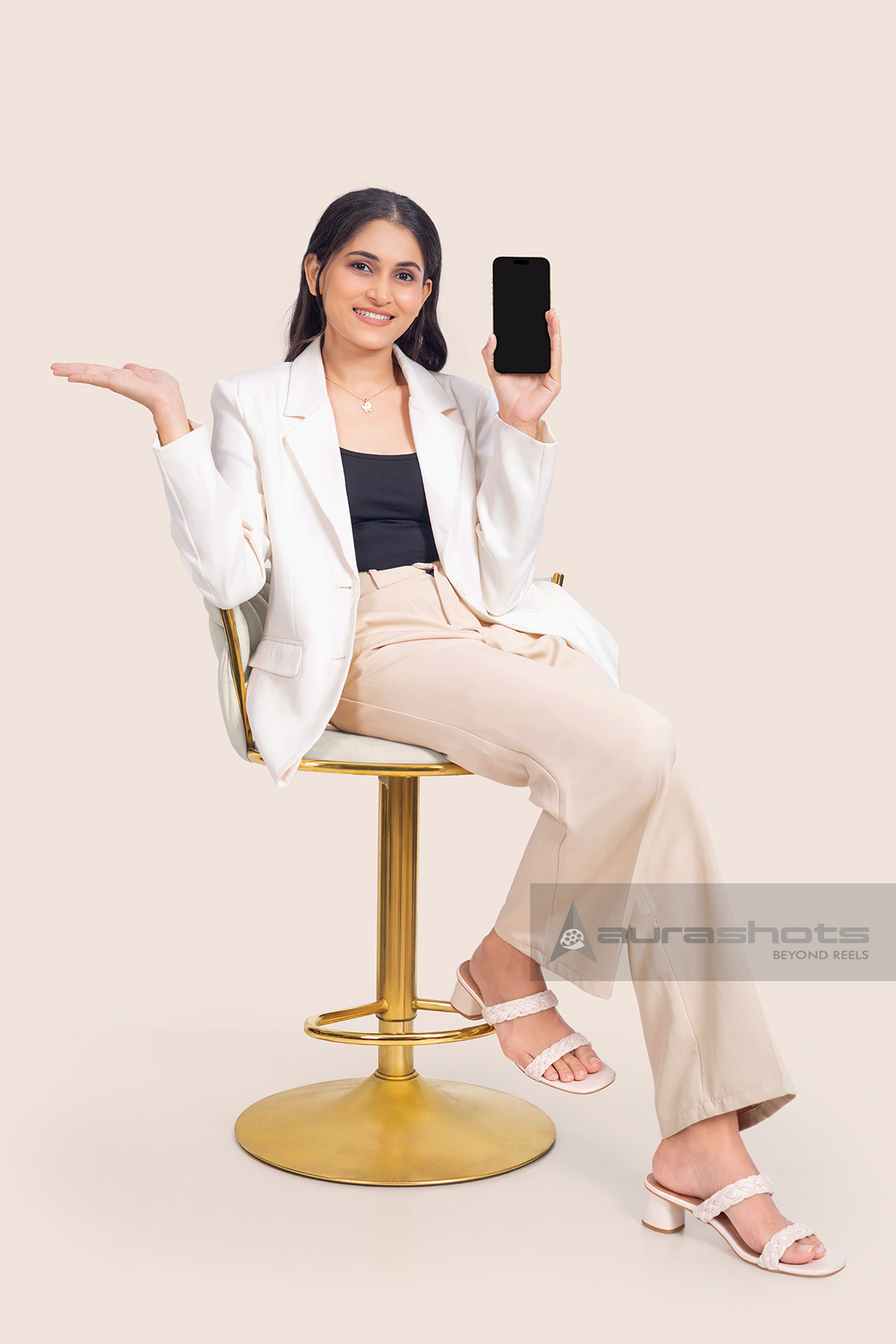 AS26030461-Indian business woman showing smartphone screen while presenting product