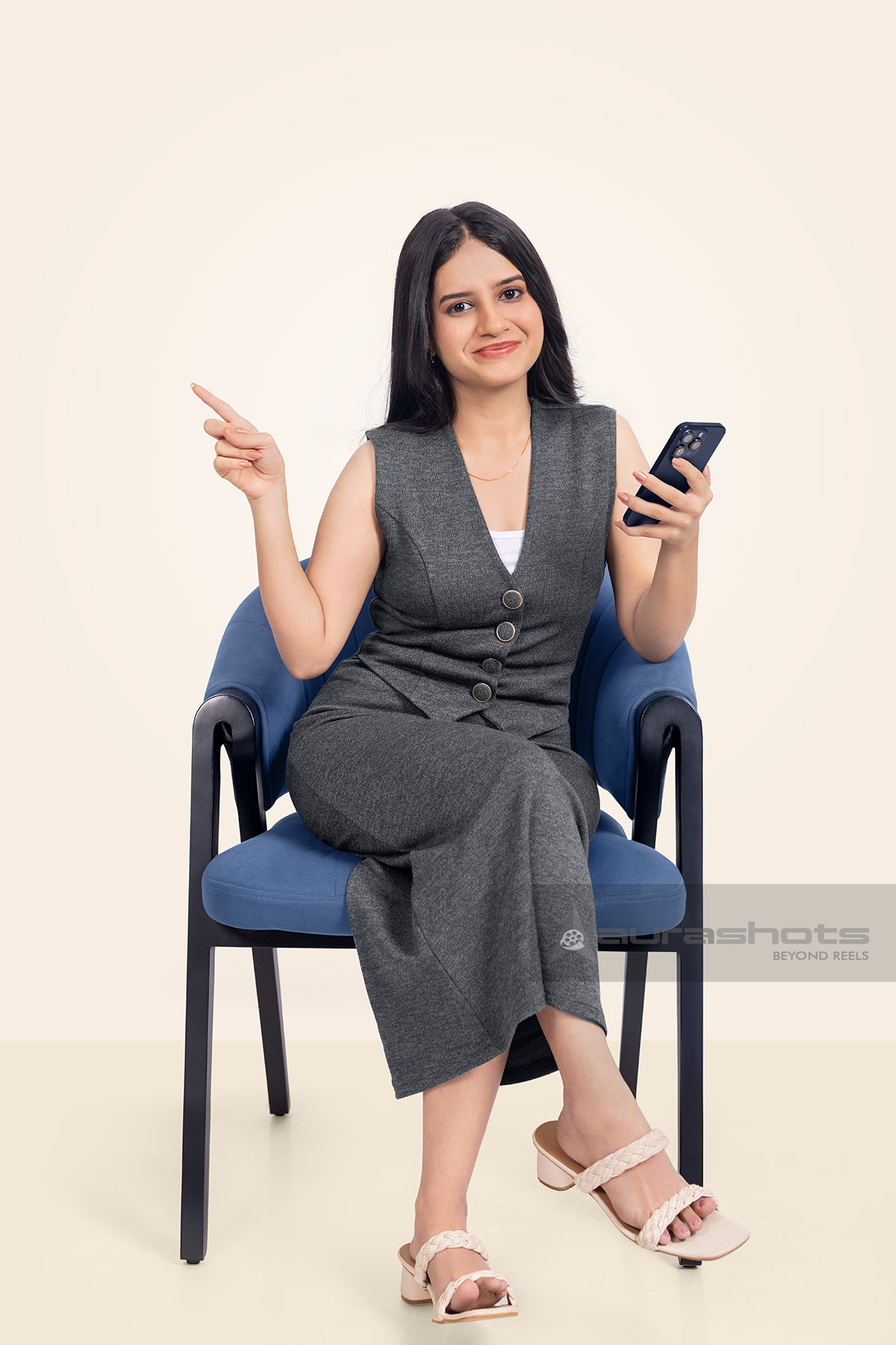AS26030383-Indian business woman sitting on chair using smartphone and pointing sideways