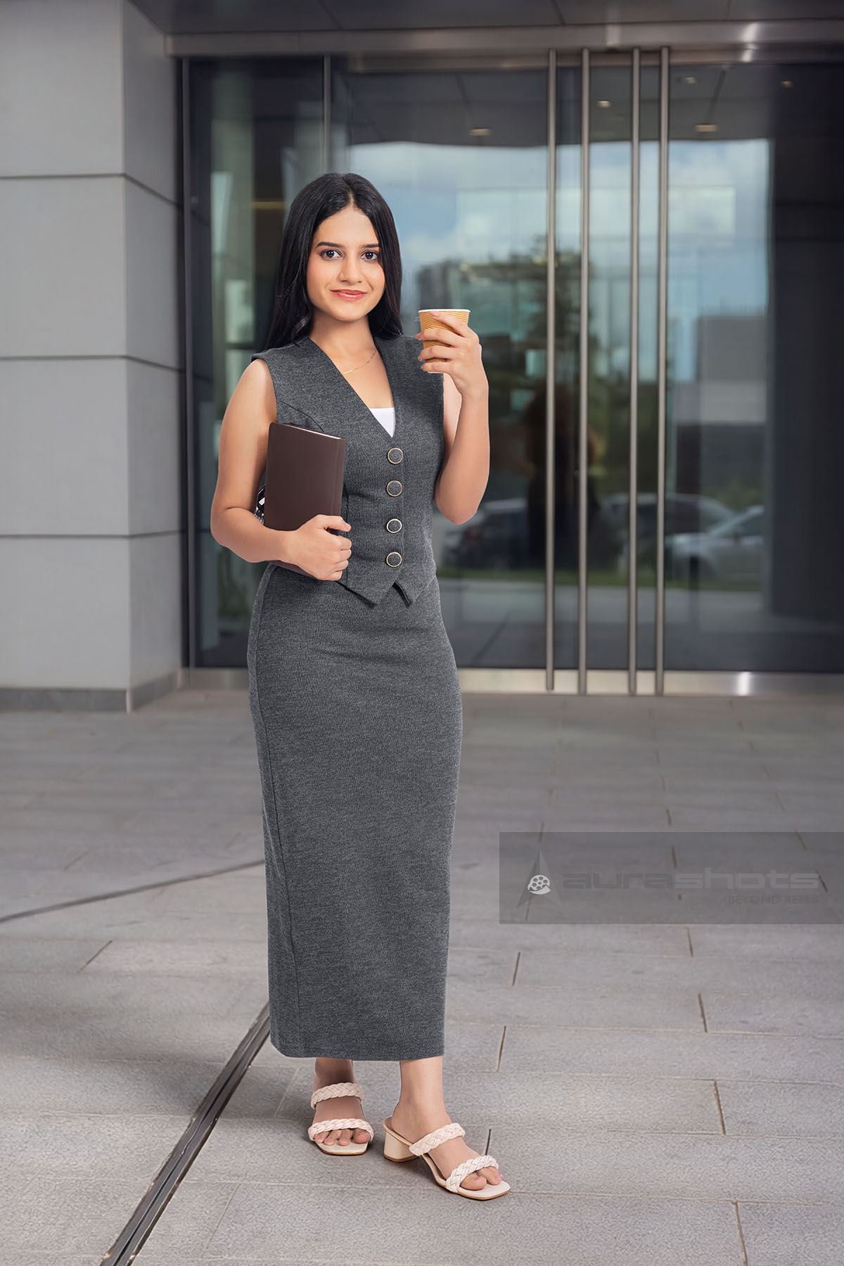 AS26030498-Indian business woman standing outside office holding coffee and notebook