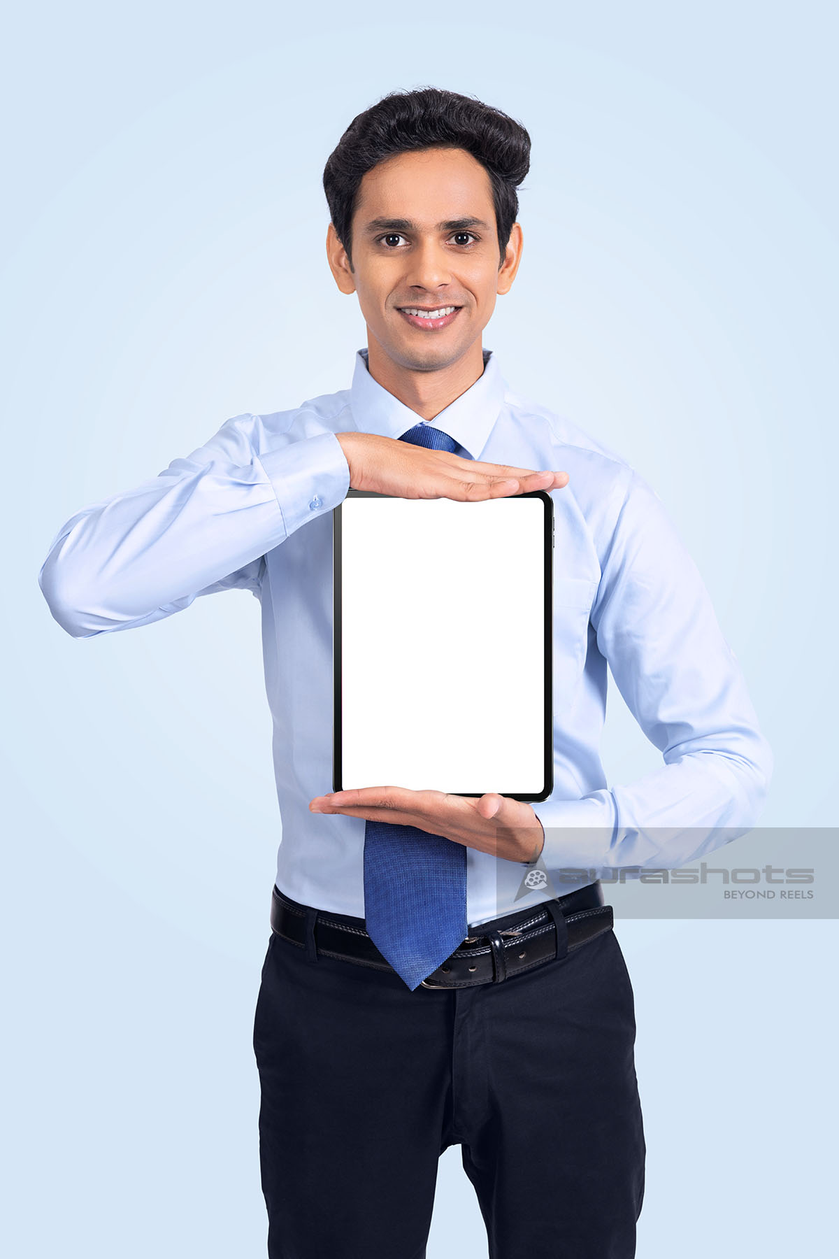 AS26030121-Indian businessman holding tablet with blank screen for app display