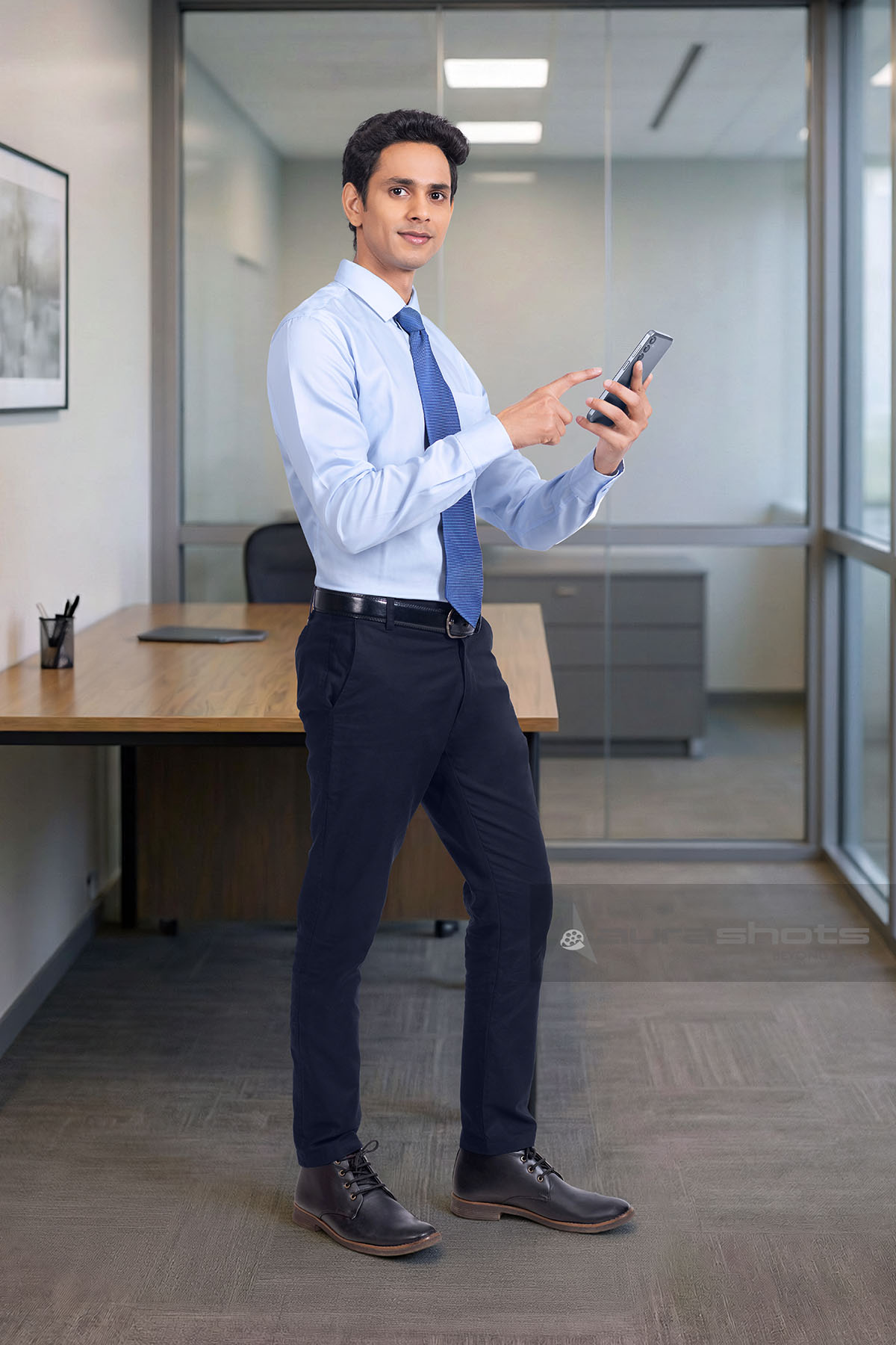 AS26030131-Indian businessman using smartphone in office with confident posture