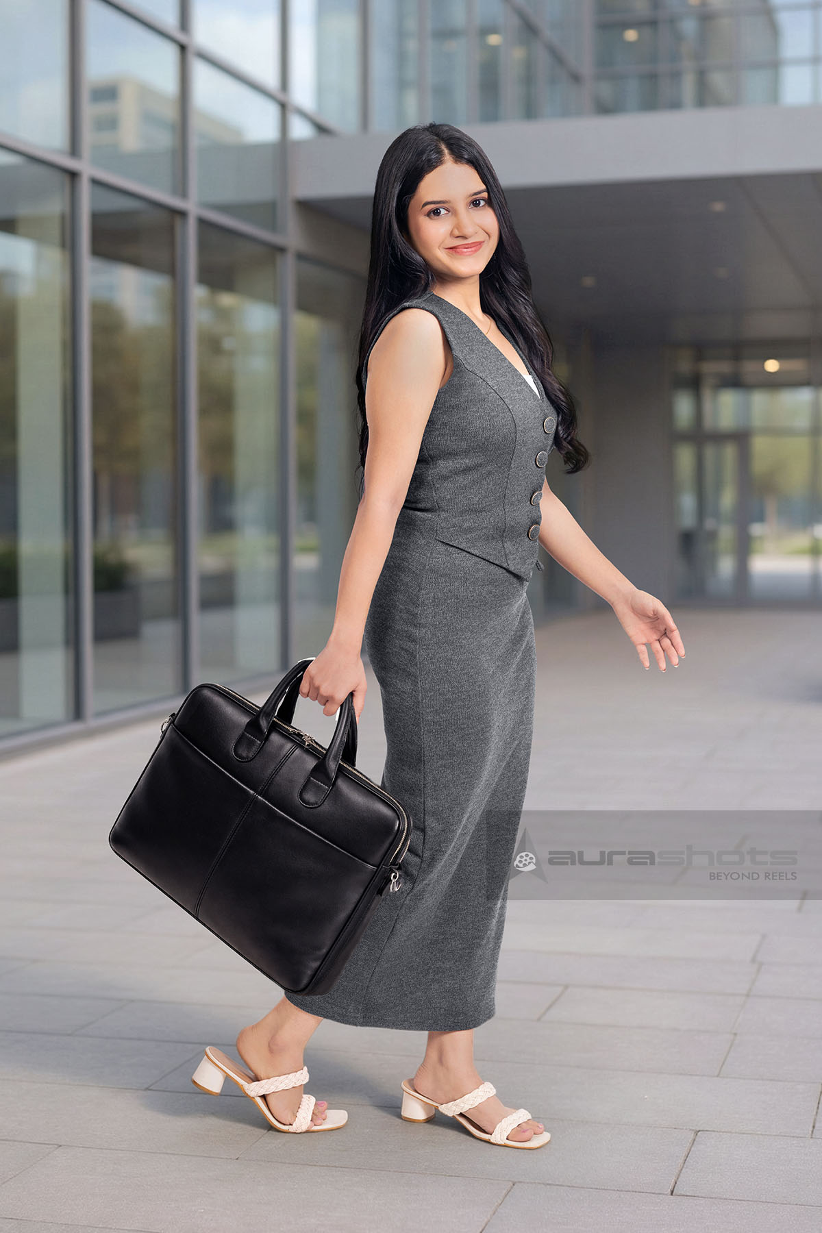 AS26030493-Indian businesswoman walking outside office building carrying laptop bag