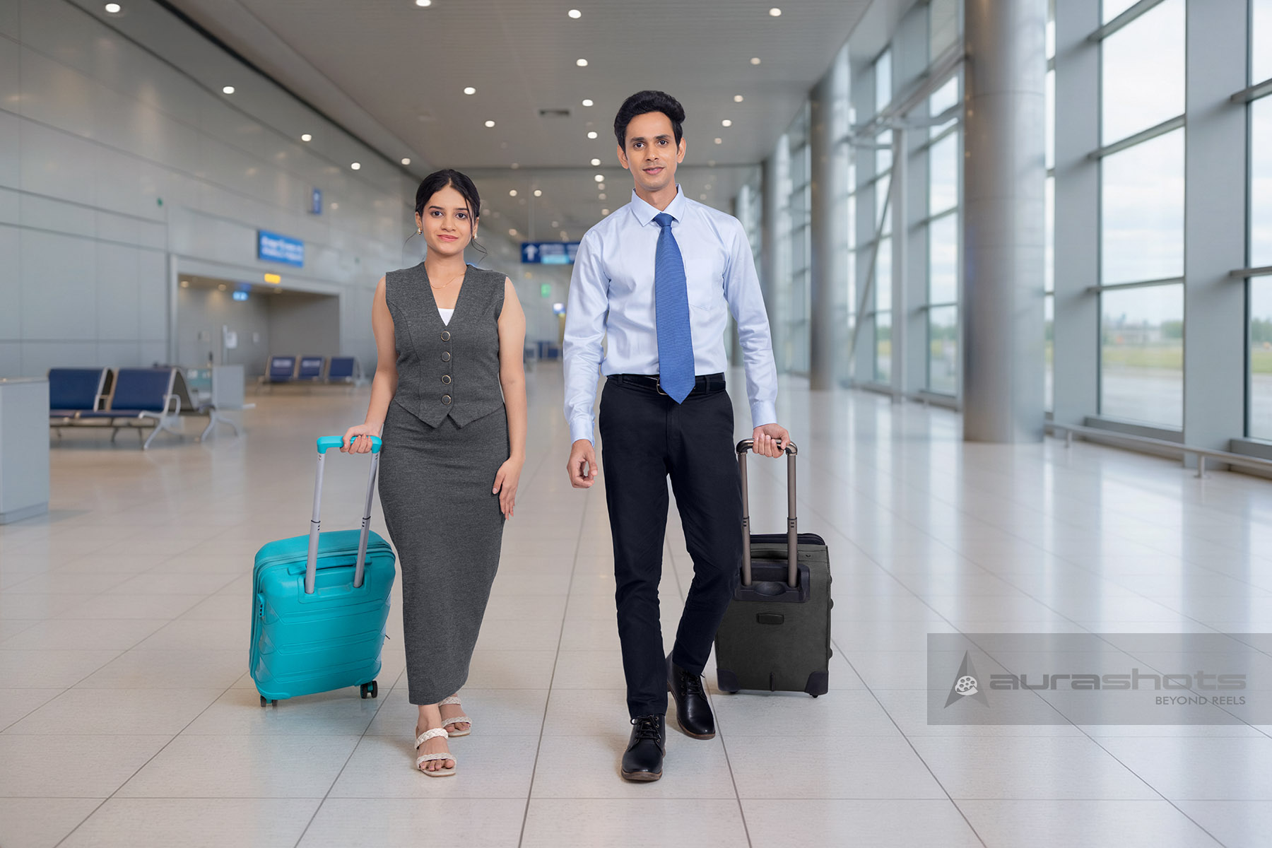 AS26030717-Indian corporate couple walking confidently in airport with luggage front view