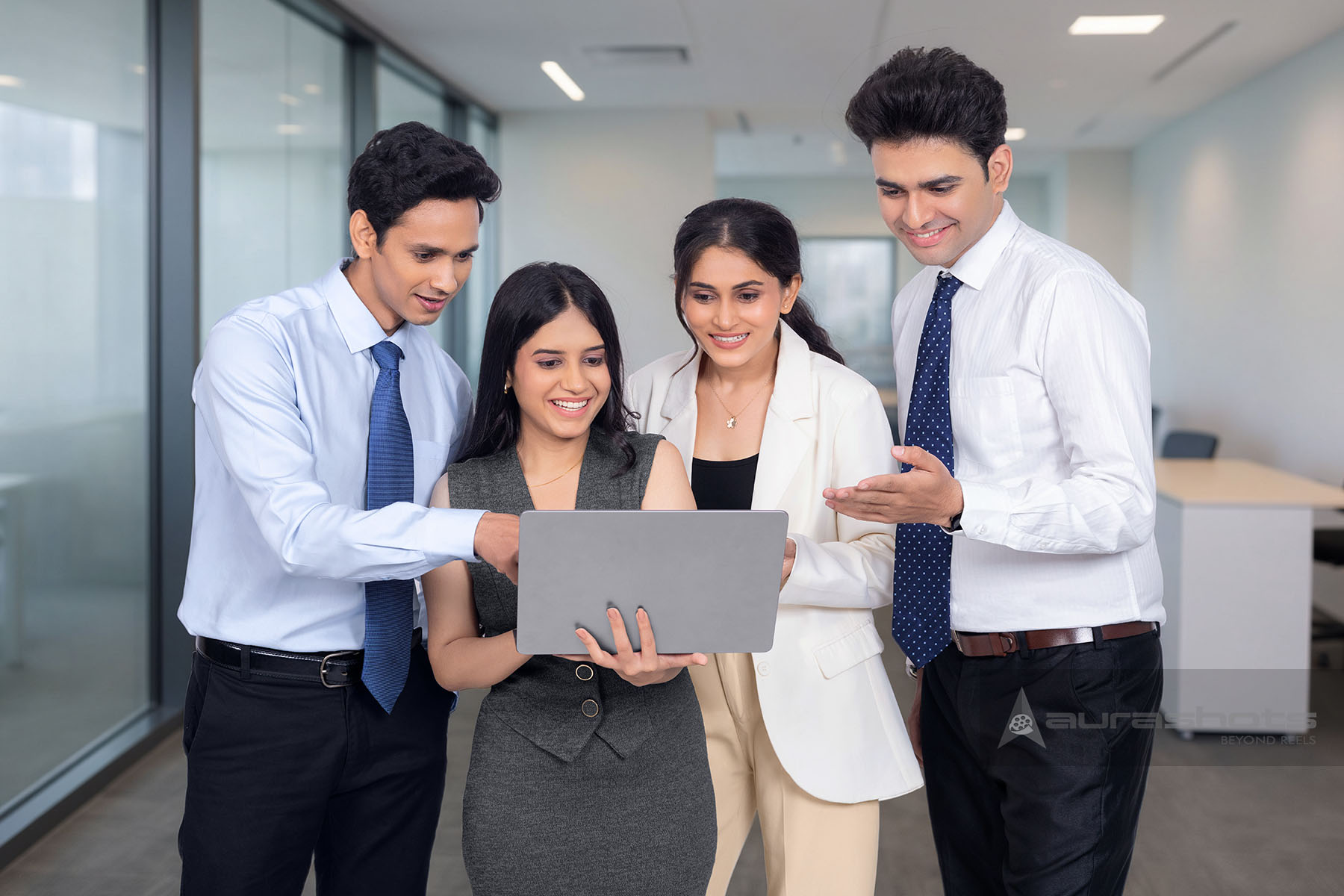 AS26030657-Indian corporate team discussing laptop project in modern office