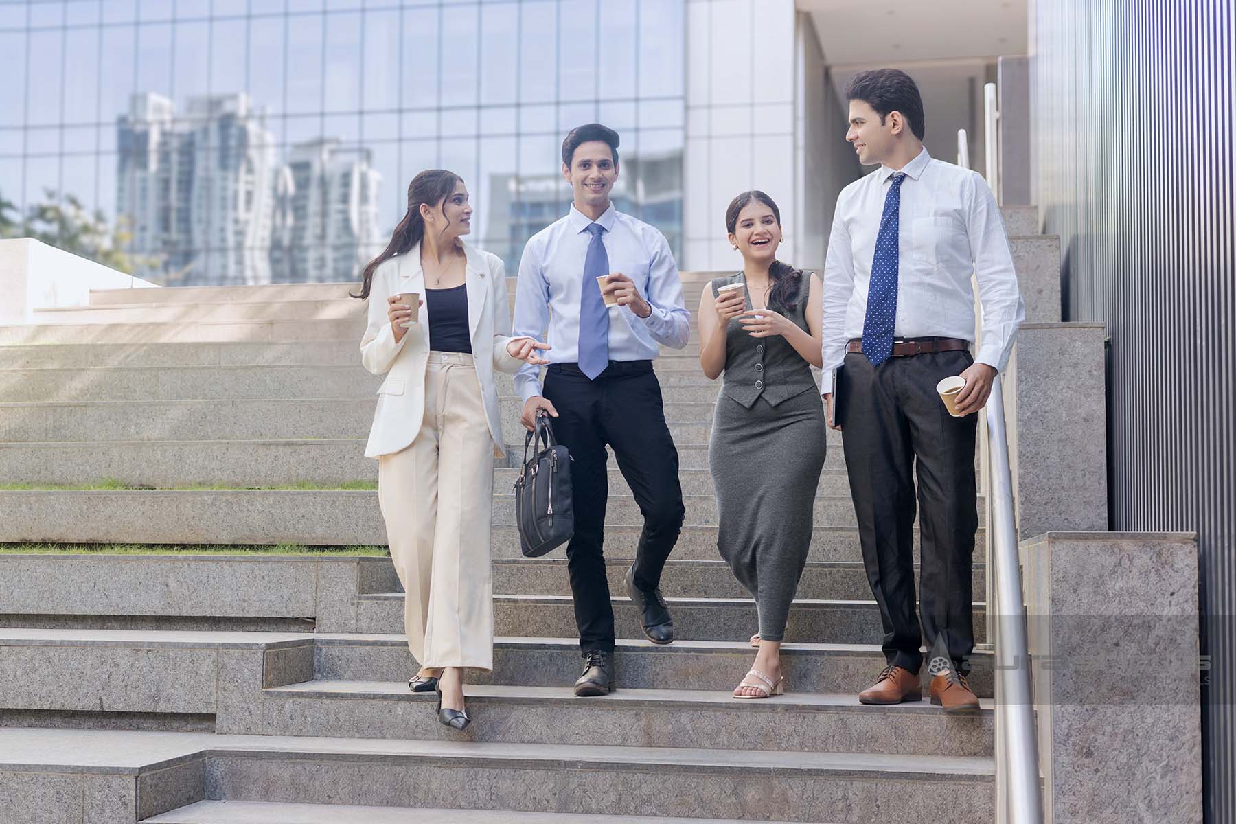 AS26030789-Indian corporate team walking down stairs outside office building in discussion
