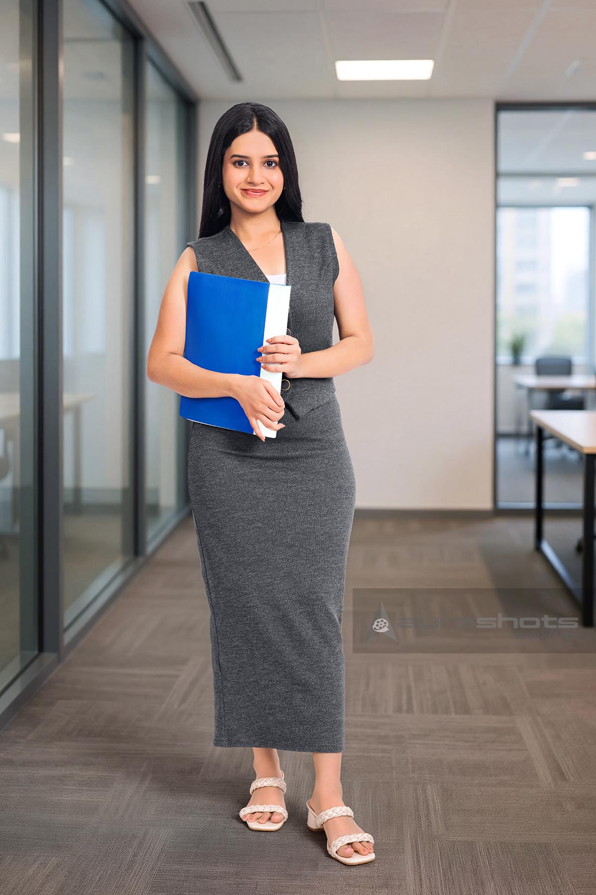 AS26030494-Indian corporate woman holding files standing in office corridor