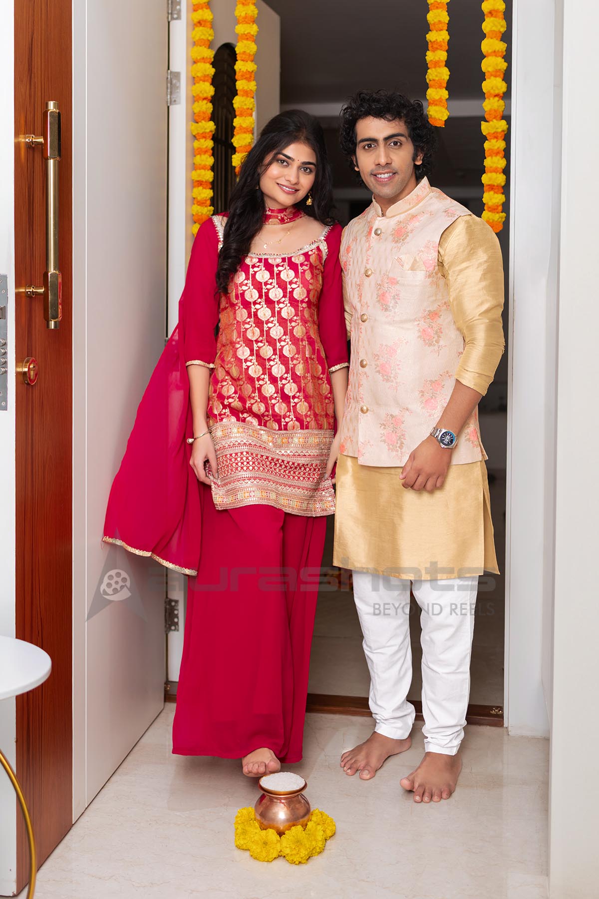 AS25040272-Indian couple entering new home doing kalash puja at decorated home entrance