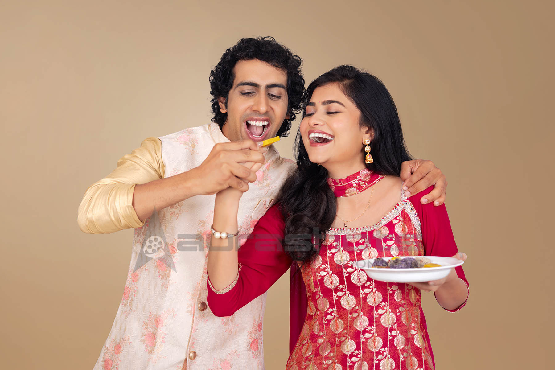 AS25040287-Indian couple feeding sweets to each other during a festive celebration