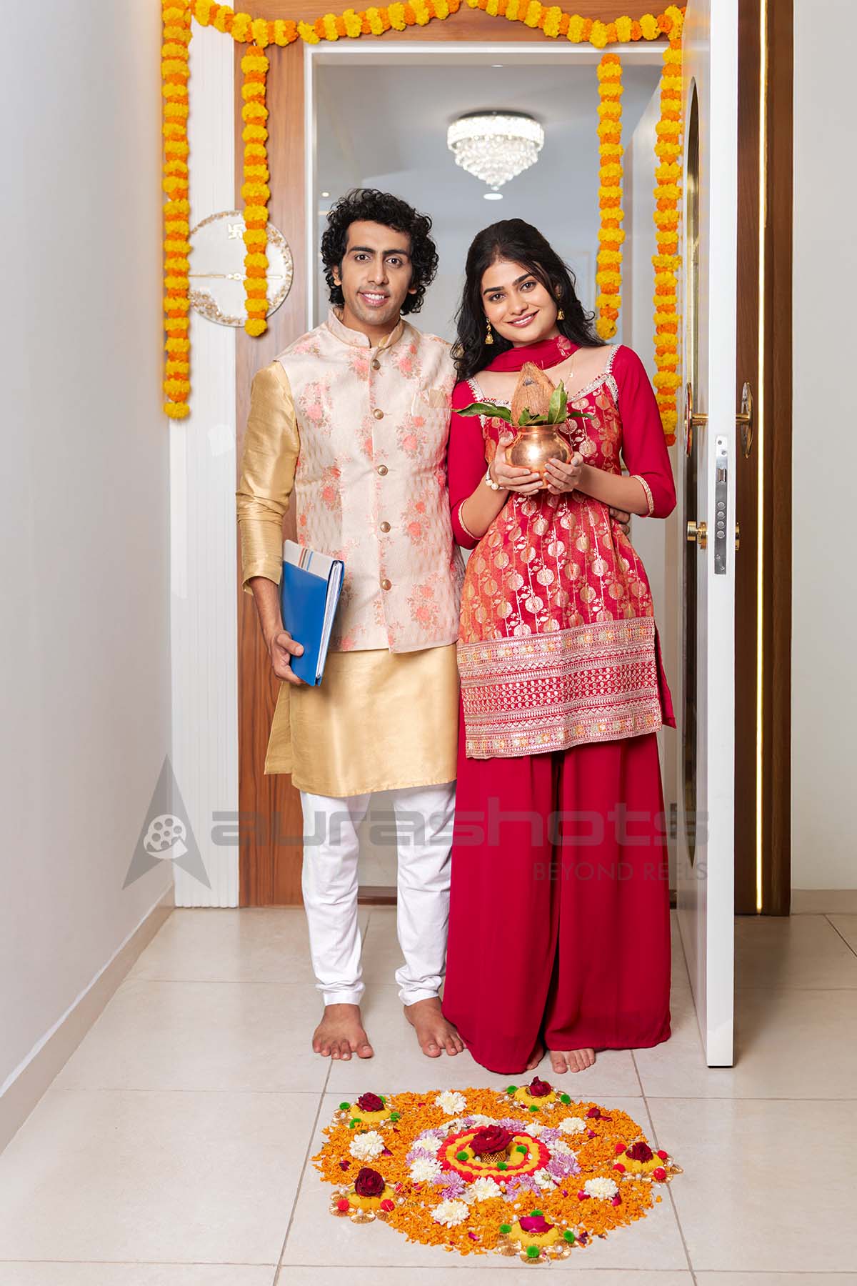 AS25040252-Indian couple holding kalash near rangoli at home entrance