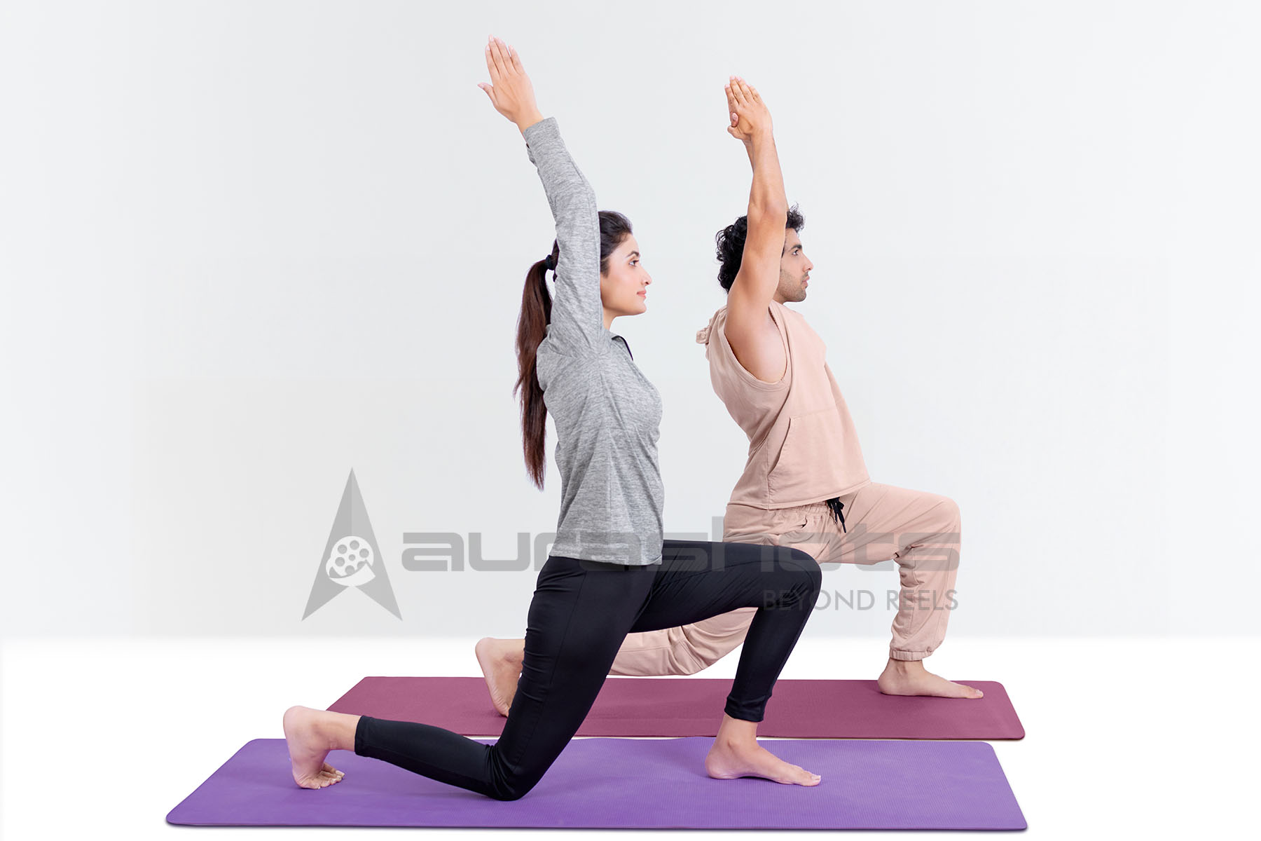 AS25020554-Indian couple performing high lunge yoga pose