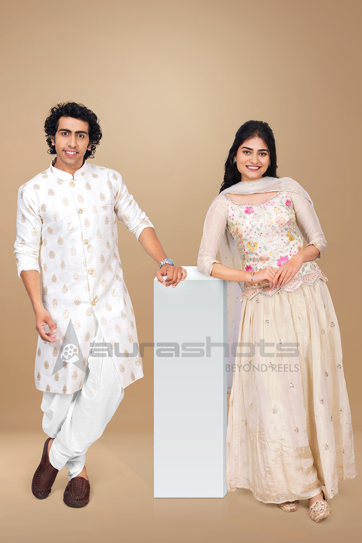 AS25040135-Indian couple posing with chair in traditional festive attire