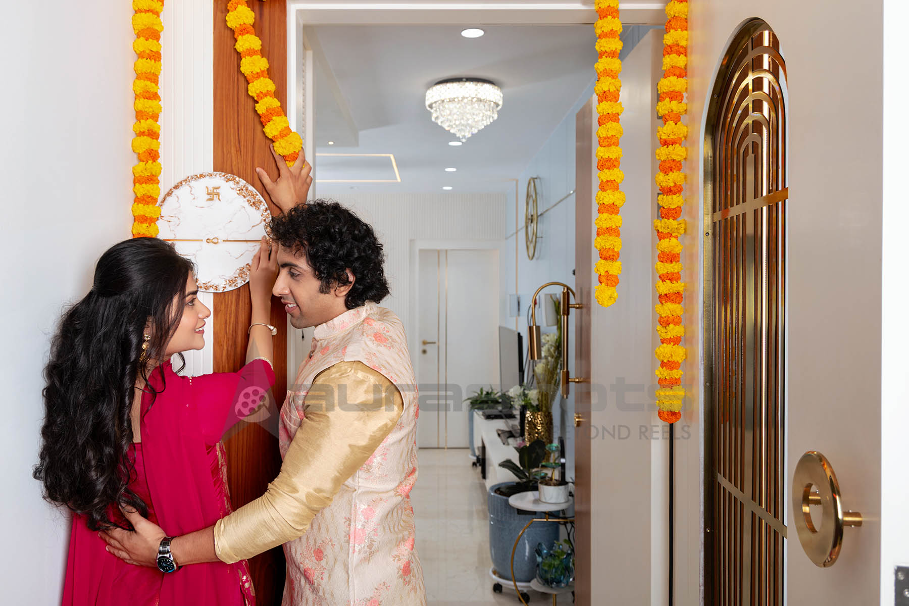 AS25040241-Indian couple standing at the new home entrance decorated with marigold garlands