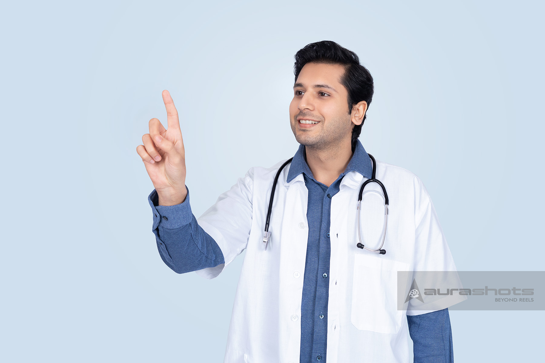 AS25110287-Indian doctor pointing upward indicating idea or guidance