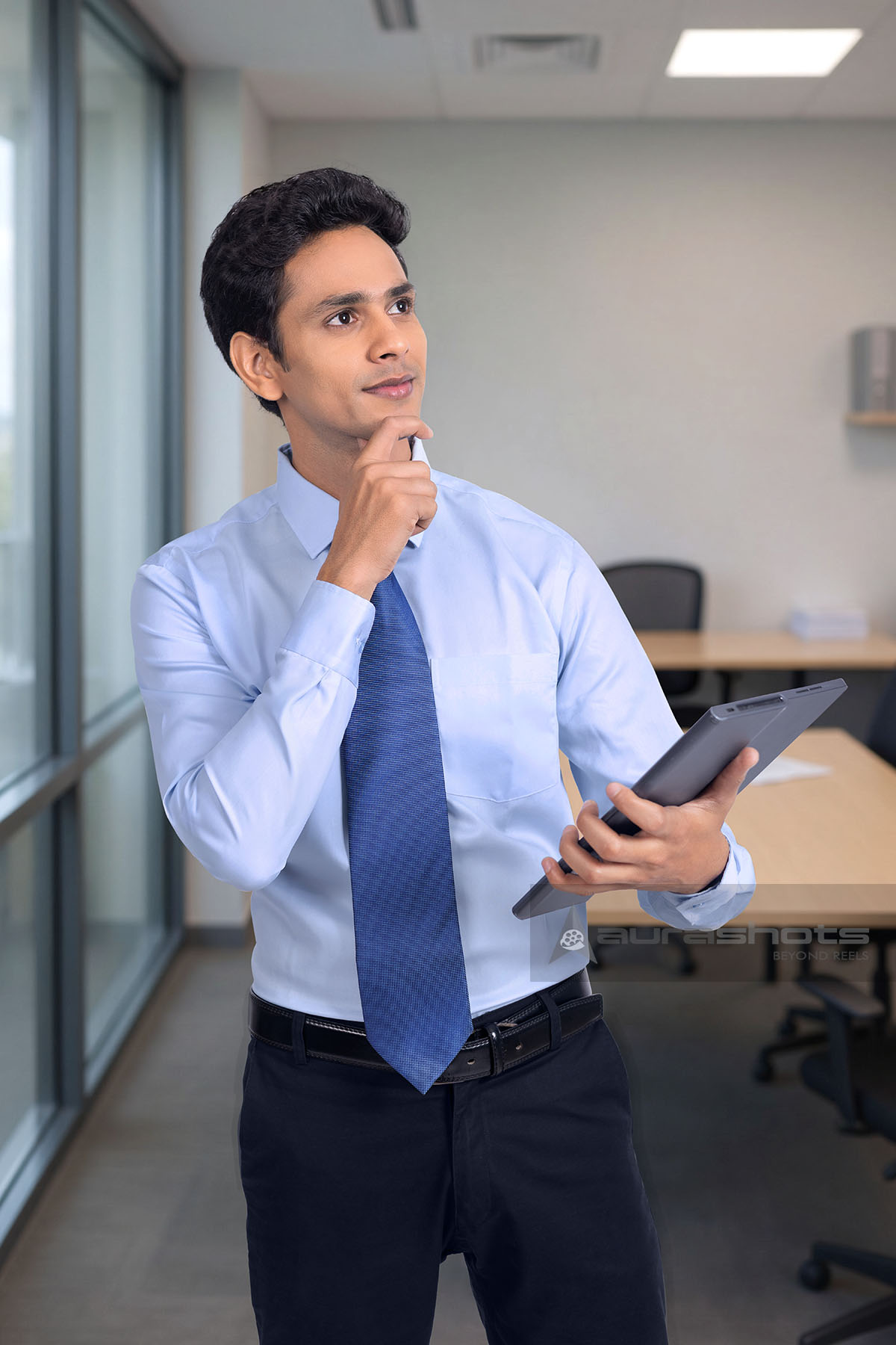 AS26030118-Indian executive using tablet while thinking in modern office space