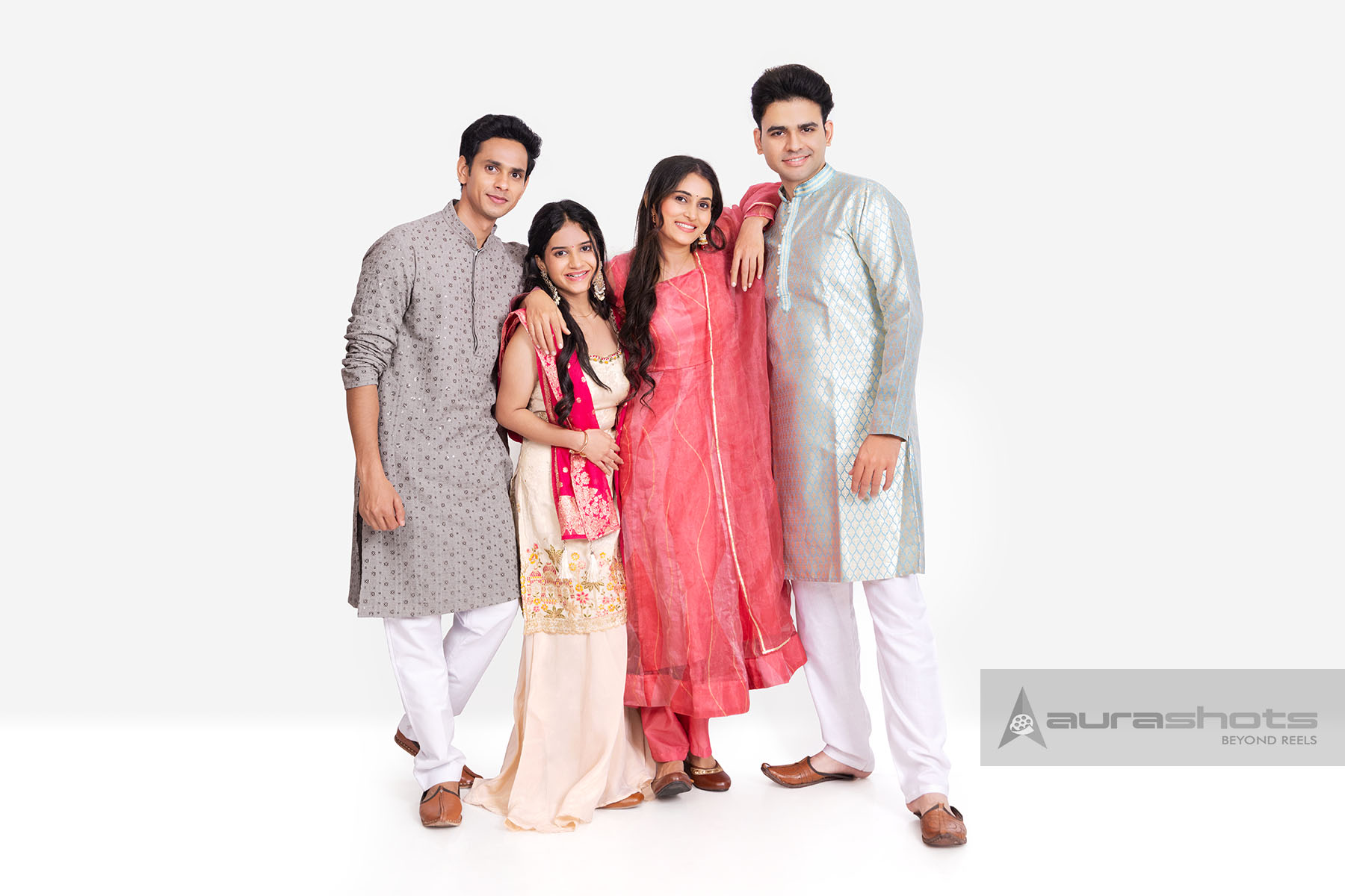 AS26010182-Indian family posing together in traditional festive attire smiling