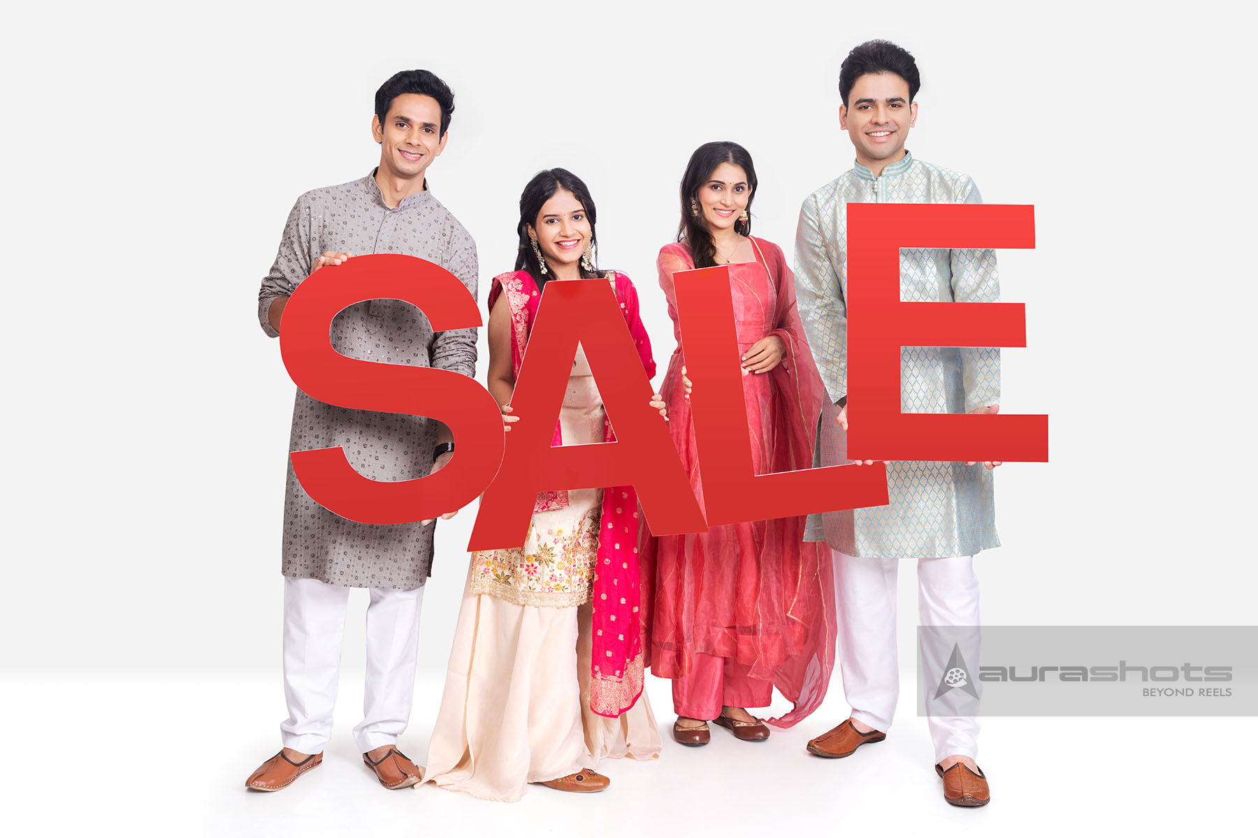 AS26010199-Indian friends holding SALE sign for festive shopping promotion
