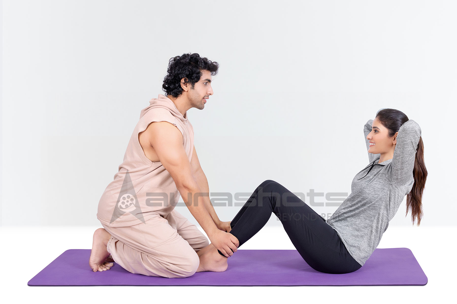 AS25020606-Indian man assisting woman in ab crunches