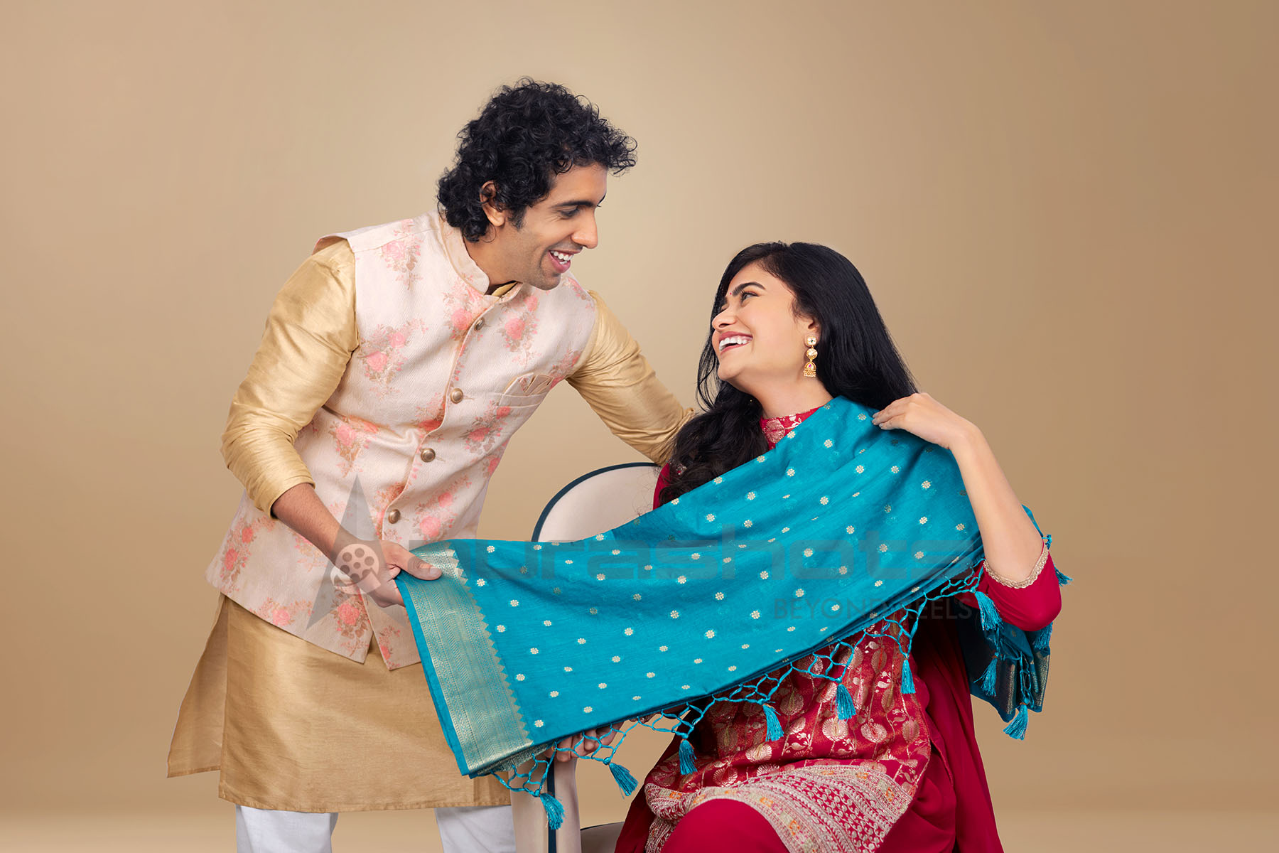 AS25040290-Indian man gifting a saree to a woman during a festive celebration