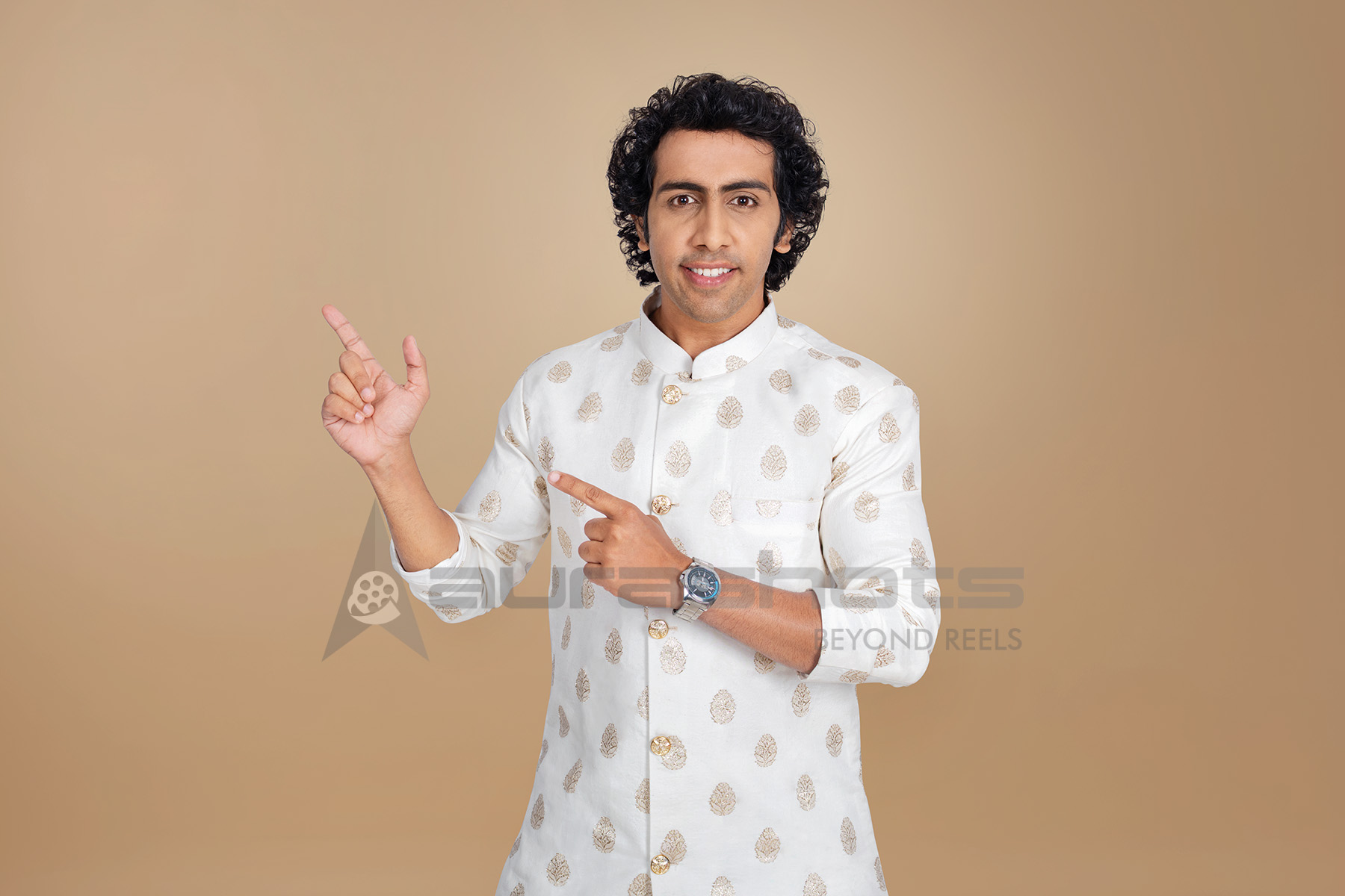 AS25040012-Indian man smiling and pointing sideways in traditional outfit