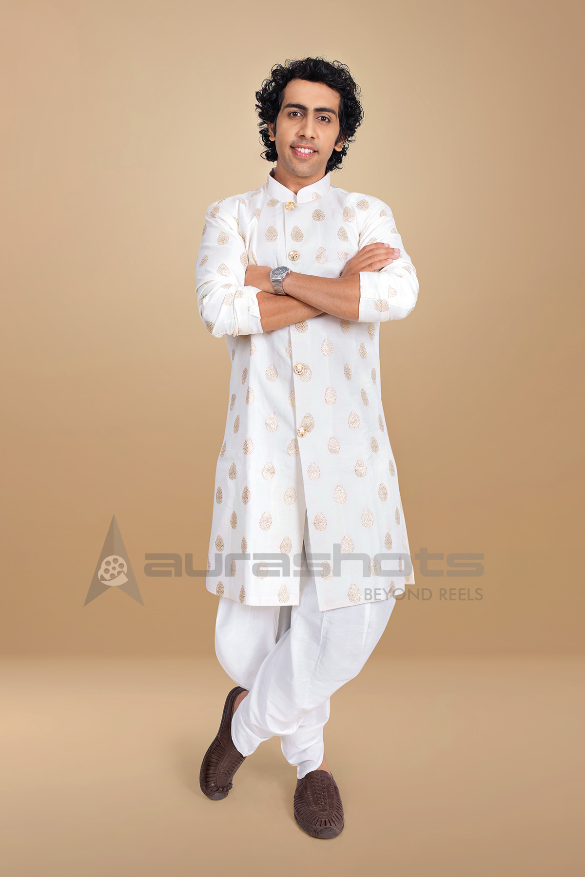 AS25040018-Indian man standing with arms crossed in traditional kurta