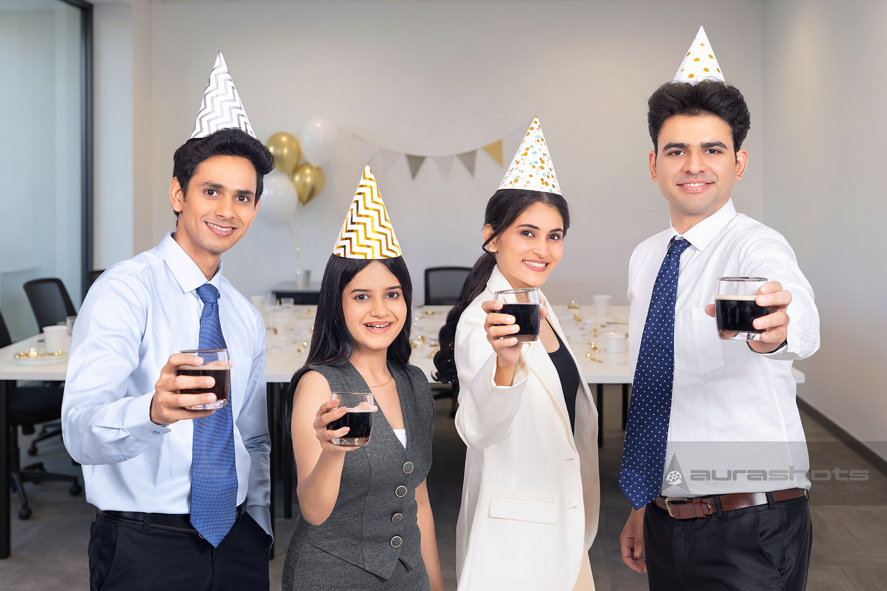 AS26030623-Indian office team celebrating birthday with drinks and party hats
