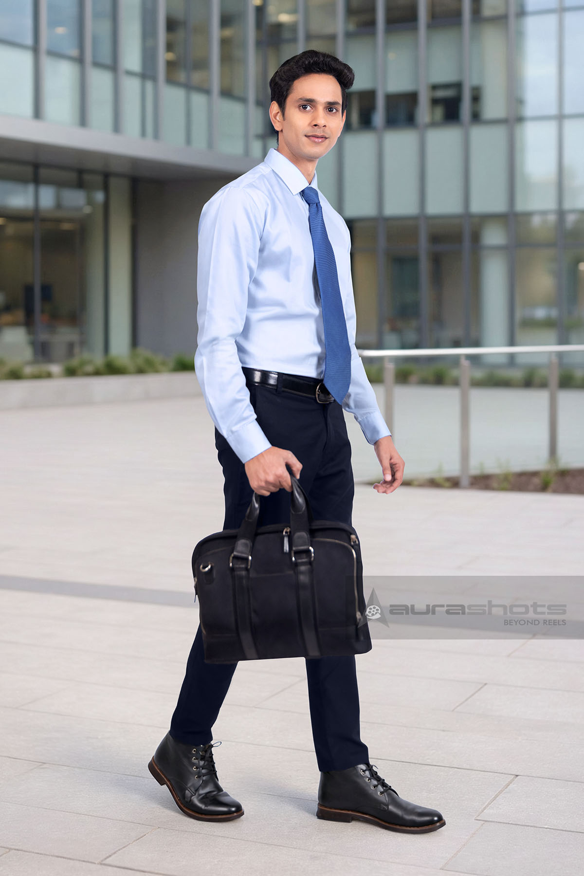 AS26030079-Indian professional walking outdoors with laptop bag in corporate campus