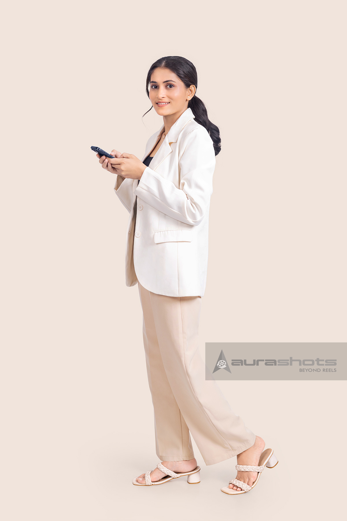 AS26030244-Indian professional woman using smartphone while walking in studio