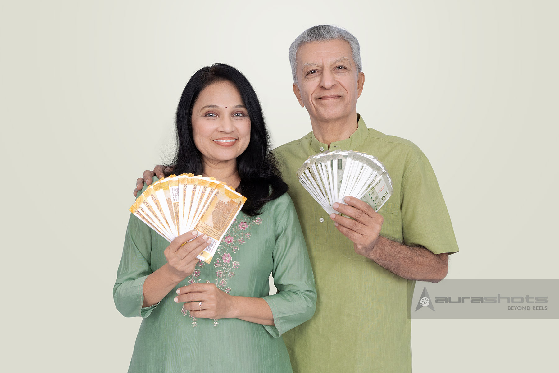 AS25150027-Indian senior couple holding cash fan showing financial security