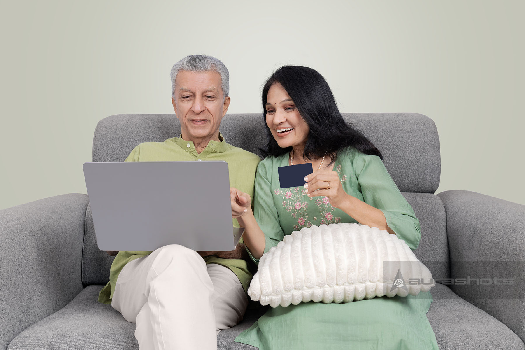 AS25150048-Indian senior couple relaxing on sofa with laptop representing comfortable modern retirement lifestyle